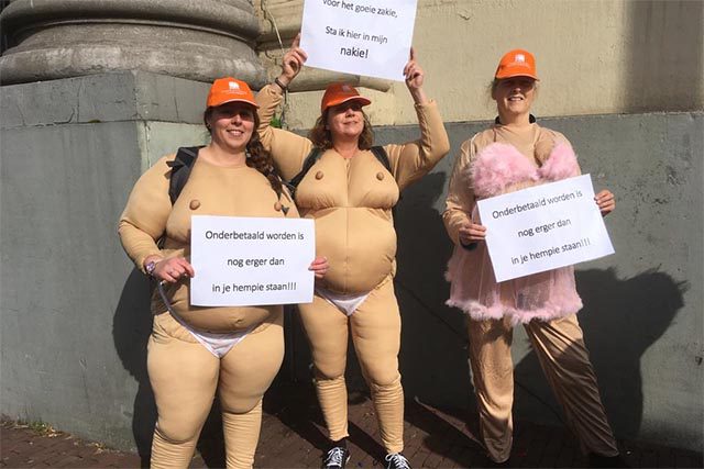 Lotte Bergen en Esther Warnaar zijn leerkrachten op de Van Koetsveldschool in Amsterdam-oost. Ze zijn inmiddels al ervaren stakers. Bij voorgaande stakingen probeerden ze op opvallende wijze aandacht te trekken voor de belangen van het speciaal onderwijs. Zo stonden ze in een naaktpak op het malieveld met de leus ‘voor beter onderwijs sta ik hier in mijn naakie’. ‘Het is leuk om er meer van te maken dan alleen maar te staken, anders wordt het zo saai.’ vertelt Esther terwijl ze foto’s laat zien van de docenten tijdens het staken. Lotte voegt daar aan toe: ‘Je staat daar tussen een enorme hoeveelheid mensen, dus dan is het wel zo leuk om op te vallen door net wat anders te doen. We willen juist de aandacht trekken met onze leuzen tijdens het staken.’. Door kritiek laten de docenten zich niet uit het veld slaan: ‘Het werd door de media omschreven als een schoolreisje voor docenten.’ zegt Esther. ‘Mensen vonden dat we maar gewoon ons werk moesten doen in plaats van herrie te maken. Daar ben ik het niet mee eens. Het is geen stille mars, we komen daar om een punt te maken.’.
