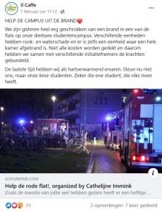 De gevolgen van de brand leven sterk in de studentengemeenschap. Op de gezamenlijke facebookpagina verschenen niet alleen tekenen van medeleven, maar werden ook allerlei verschillende acties opgezet om de getroffen bewoners te helpen. Het team van het café op de campus, Il Caffè, nam het initiatief om de krachten te bundelen.