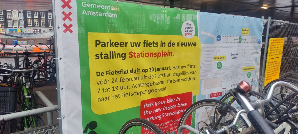‘De Fietsflat sluit op 30 januari.’ Op de dag zelf worden steigerdoeken met deze tekst rond de fietsenstalling opgehangen. De doeken hangen er met een reden: maandagochtend moeten tientallen mensen worden weggestuurd bij de Fietsflat. Fietsers hebben nog tot 24 februari de tijd om hun stalen ros uit de rekken te halen. Daarna zullen ze een afspraak moeten maken bij het fietsdepot in het Westelijk Havengebied als ze hun fiets ooit nog terug willen zien. Binnenkort is het nergens rond Amsterdam Centraal mogelijk om je fiets langer dan 24 uur gratis te stallen. De laatste fietsenstalling waar dit nog kan, Fietsenstalling IJzijde, zal volgens de Gemeente Amsterdam binnenkort sluiten.