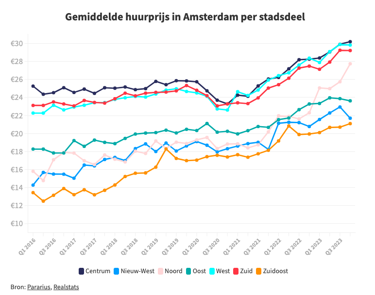 Volgens de Huurmonitor van woningplatform Pararius kwam de gemiddelde vierkante meterprijs in het centrum het afgelopen kwartaal voor het eerst boven de 30 euro uit. Nieuwe huurders in dit stadsdeel betalen daarmee 6,8 procent meer dan een jaar geleden. Ook in West en Zuid komen de huurprijzen dichter bij de 30 euro-grens: nieuwe huurders betalen daar respectievelijk 29,82 euro en 29,21 euro per vierkante meter. Noord is de grote uitschieter; met een vierkante meterprijs van 27,74 euro is de gemiddelde huur daar met 24,4 procent gestegen ten opzichte van vorig jaar.
