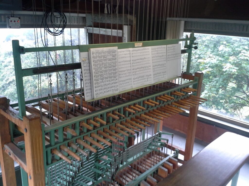 De beiaard bestaat uit een klavier en een pedaal, die Zwart als een soort piano bespeeld. De beiaard is met draadjes verbonden aan de kegels in de klokken van de torens. Je kunt ze zoals Zwart dus actief bespelen, of je laat een hamertje boven de klokken je arrangement automatisch afspelen. Dat laatste gebeurt elk kwartier.