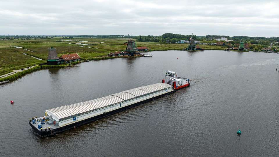 ‘Er zijn wel andere boten in de markt die vergelijkbaar zijn, maar dan heb je het al gauw over kleinere vormen van watertransport. Wij zijn de eerste met een combinatie van één E-Pusher en vier E-Barges die grotere hoeveelheden kunnen verschepen, zonder dat er een dieselmotor achter de hand is. Deze E-pusher kan een bak met een inhoud van 1200 ton voortduwen. Dat is fors.’