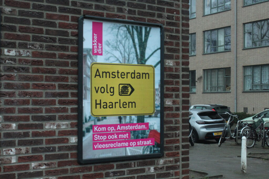 ‘Kom op Amsterdam. Stop ook met vleesreclame op straat’, staat er op posters door heel het centrum van Amsterdam geëtaleerd. Ook in Amersfoort en Breda staan dergelijke posters van de dierenwelzijnsorganisatie. De gemene deler? Een meerderheid van de partijen in de Raden zijn links. ‘Waarom zou je als gemeente dan nog reclame faciliteren die mensen juist verleidt om meer vlees te eten?’ vraagt Wakker Dier-woordvoerder Collin Molenaar zich af in een persbericht.