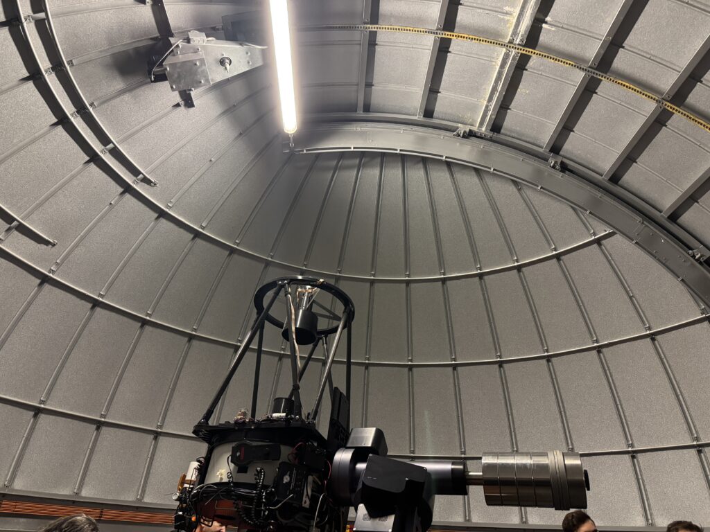 De rondleiding voert door de gangen van het instituut, die volhangen met sterrenkundige posters en foto’s. Eerste punt van interesse: de tafel in de gezamenlijke ruimte van de wetenschappers. Daarna stommelt de groep de trap op naar het dak, vanwaar je in de koepels komt waar de telescopen staan. Bij gebrek aan zichtbare sterren nemen de bezoekers de telescopen goed in zich op. Hoe zwaar de paal is waar de telescoop op staat, wil de jongste bezoeker weten. Dat is helaas niet bekend. Wel mag hij met een druk op de knop het bovenste deel van de koepel knarsend laten draaien.