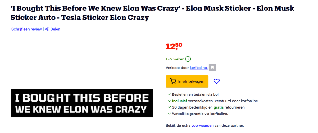 Volgens het Eenvandaag opiniepanel overweegt 31% van de Teslabezitters zijn auto te verkopen door de gedragingen van Musk. Een deel hiervan heeft dit al gedaan. Anderen kiezen voor minder rigoureus verzet, door bumperstickers te plakken met de tekst ‘I bought this before we knew Elon was crazy’.