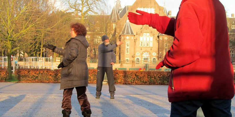 Deze ochtend hebben tien leerlingen zich rond de meester in het park verzameld. De gemiddelde leeftijd van de groep lijkt in de zestig. Iedereen is ingepakt in meerdere truien of een dikke winterjas, sjaals, mutsen en handschoenen. Hier en daar hangt een druppel aan het puntje van een koude neus. In het ritme van de bewegingen verschijnen witte ademwolkjes.