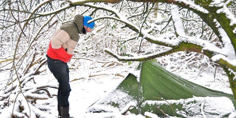 De verse sneeuw kraakt onder de laarzen van Elmar van Hoevelaak. De Oeverlanden, een stukje natuurgebied ingeklemd tussen het water van de Nieuwe Meer en de A4, liggen er verlaten bij. In de verte klinkt het geluid van voorbijrazend verkeer. Midden op het bospad stopt Van Hoevelaak plotseling met lopen. Hij heeft iets gezien. Het blijkt een koepeltentje, goed gecamoufleerd door takken en een laag sneeuw. Alleen een stukje rood zeil is zichtbaar. “Hallo? Is daar iemand?” Van Hoevelaak tikt zachtjes op het zeil van de tent. Er komt geen reactie. “Hallo?” probeert hij nog een keer. “No police!” Het blijft stil.
