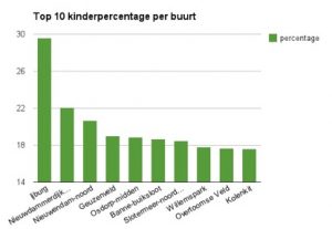 De top tien van meest kinderrijke buurten in Amsterdam in 2012, in aflopende volgorde. Grafiek: Femke Awater en Jonas Kooyman. 04 februari 2013, 15:24 - Jonas Kooyman
