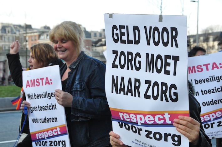 “Heb je je wandelschoenen aan?” vraagt een actievoerster met een Indisch uiterlijk en een fluoriscerend geel hesje aan de verslaggeefster van een lokale nieuwszender. “We lopen zo naar het Paroolgebouw.” Het is half twee, vrijdagmiddag. Zo’n 75 mensen hebben zich verzameld bij de ingang van het Dr. Sarphatihuis in de Roetersstraat, een van de locaties van de Amsterdamse zorginstelling Amsta.