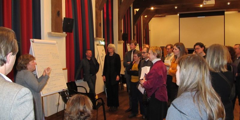 Na tien stellingen is de zaal warm om zelf verder te discussiëren. De groep wordt verdeeld in acht kleine groepjes rond flipovers met een kaart van het complex. Elk groepje zal een ander thema, zoals ‘icoon’ en ‘flexibiliteit’, verder uitdiepen. Bij ‘uitstraling en sfeer’ strijken twee studenten, een medewerker en een bewoner neer.