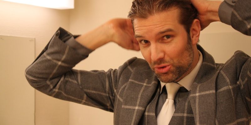 Vijf voor acht. Nu moesten we maar eens gaan. Maar nog “genoeg tijd” voor een rondleiding achter het podium. Langs de decorstukken – van dichtbij ziet de witte bar op rolletjes met champagneflessen er een stuk minder glamoureus uit – en het hoekje waar de acteurs en actrices zich tijdens de voorstelling kunnen omkleden. “Nog vijf minuten, Bas!”, roept de stagemanager. Muijs reageert laconiek. Ach ja, veel hoeft hij niet te doen, zegt hij zelf. “Mijn pak heb ik zo aan, geschminkt word ik niet.” Alleen maar wat gel in zijn haren, dat is alles. “Er gaan wel twee tot drie tubes per week doorheen.”