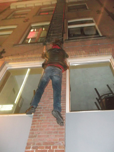In de Regulierssteeg, vlakbij het Rembrandtplein weet Victor een makkelijke klim voor beginners. Er loopt een brandladder omhoog, tot op het dak. Vanaf daar kun je over een doolhof van daken naar het Muntplein lopen. “Daar kun je lekker chillen op het reclamebord van de ABN Amro.” Het enige probleem is: de ladder begint pas op vier meter boven de grond. Hoe je daar komt? Victor klimt met beide benen op de vensterbank van het pand. Zijn handen plaatst hij aan weerszijden van een smalle reep muur tussen twee ramen in. Zijn voeten weten grip te vinden op de gladde bakstenen. Met een arm grijpt hij de onderste trede van de stalen trap en hijst zichzelf omhoog. “Je moet wel sterke armspieren hebben.” Nog geen twintig seconden na de aanvang van zijn klim staat hij alweer op de grond.