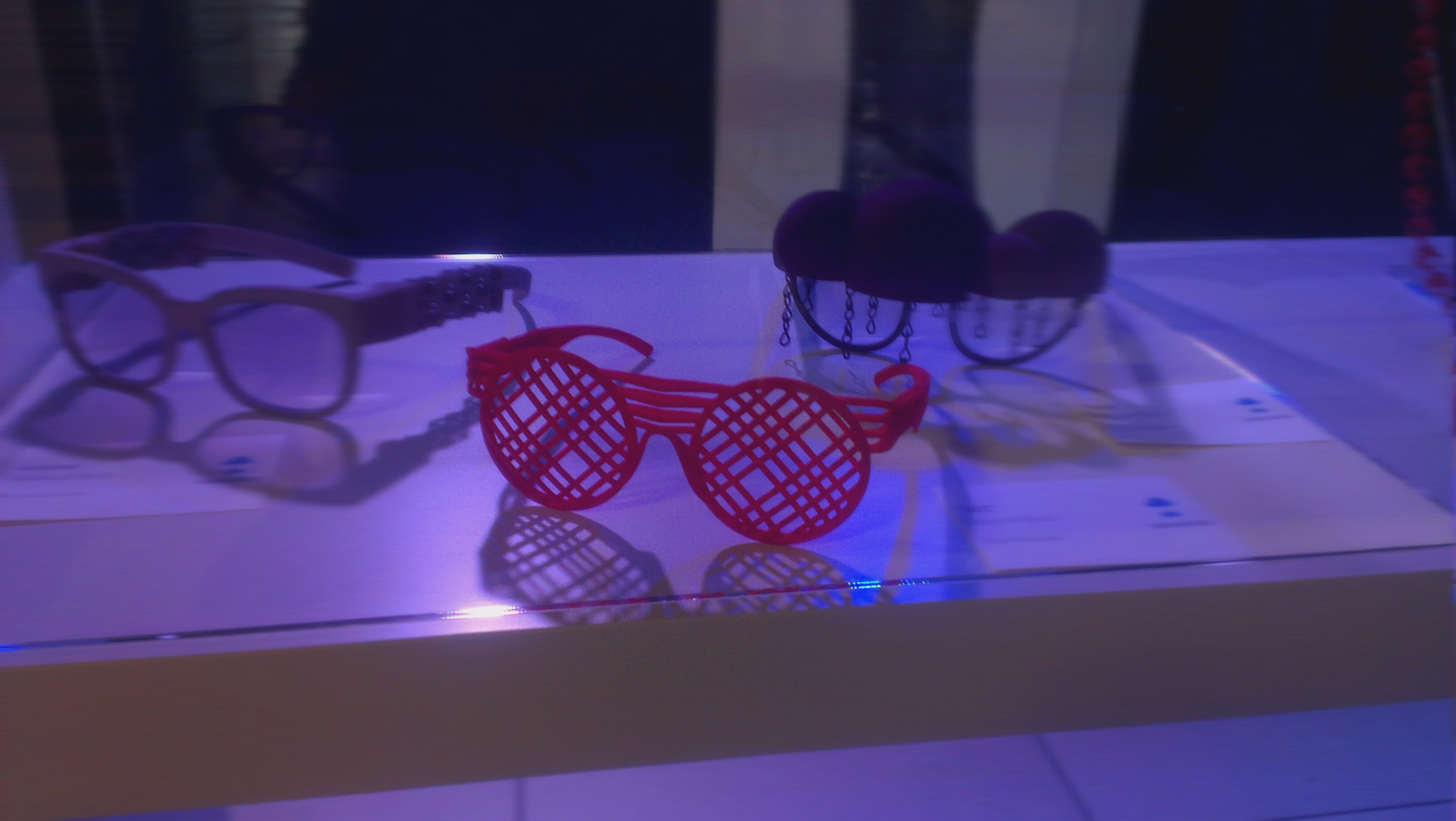 Over de loop van de middag zijn er niet meer dan vijftien bezoekers tegelijkertijd aanwezig, maar dankzij de machines heerst er toch bedrijvigheid. In één hoek staan echter geen 3D-printers. Het enige wat hier beweegt is het licht, dat ritmisch van kleur verandert. Paspoppen laten het roerloos over zich heen glijden. Hetgeen wat hen om de nek hangt is dat wat de aandacht trekt.