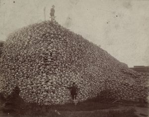Een stapel bizonschedels ligt klaar om tot kunstmest vermalen te worden; Verenigde Staten, 1870. (Bron: Burton Historical Collection)