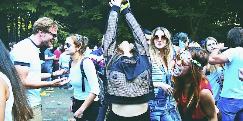 Naarstig op zoek naar een wit wijntje, banen de meiden zich een weg door de kluwen bezoekers in het bosrijke park, voor de gelegenheid aangekleed als sprookjesbos met lampionnen, glitters en een sporadische rookmachine tussen de bomen.