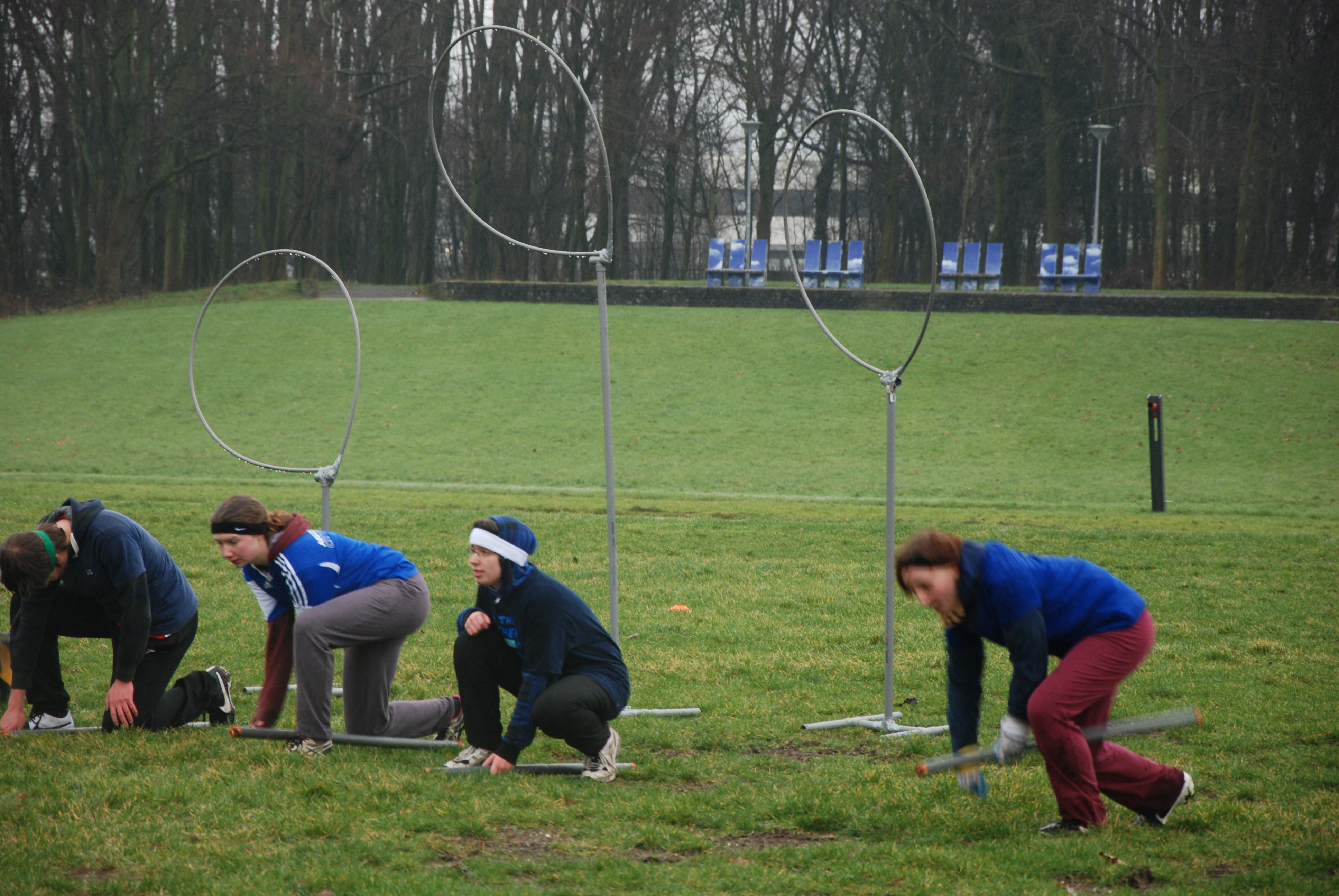“Lions ready?” “Grauw, grauw”, klinkt het vanaf de linkerkant van het veld. De scheidsrechter draait zich om naar de andere helft. “Werewolves, ready?” Een langerekt ‘woehoe’, schalt over het grasveld. Een enkele voorbijganger kijkt even om. “Ready? Brooms up!” Twaalf handen grissen een grijze stok van het gras, vier ballen vliegen door de lucht.