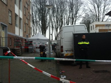 Even verderop is een Marokkaanse vrouw in gesprek met de politie. “Mijn dochter woont daar”, legt ze uit. Ze wijst naar een balkon, pal boven de plek waar de moord gebeurd is. “Sorry mevrouw”, zegt de agent, “ik mag u hier niet door laten.”