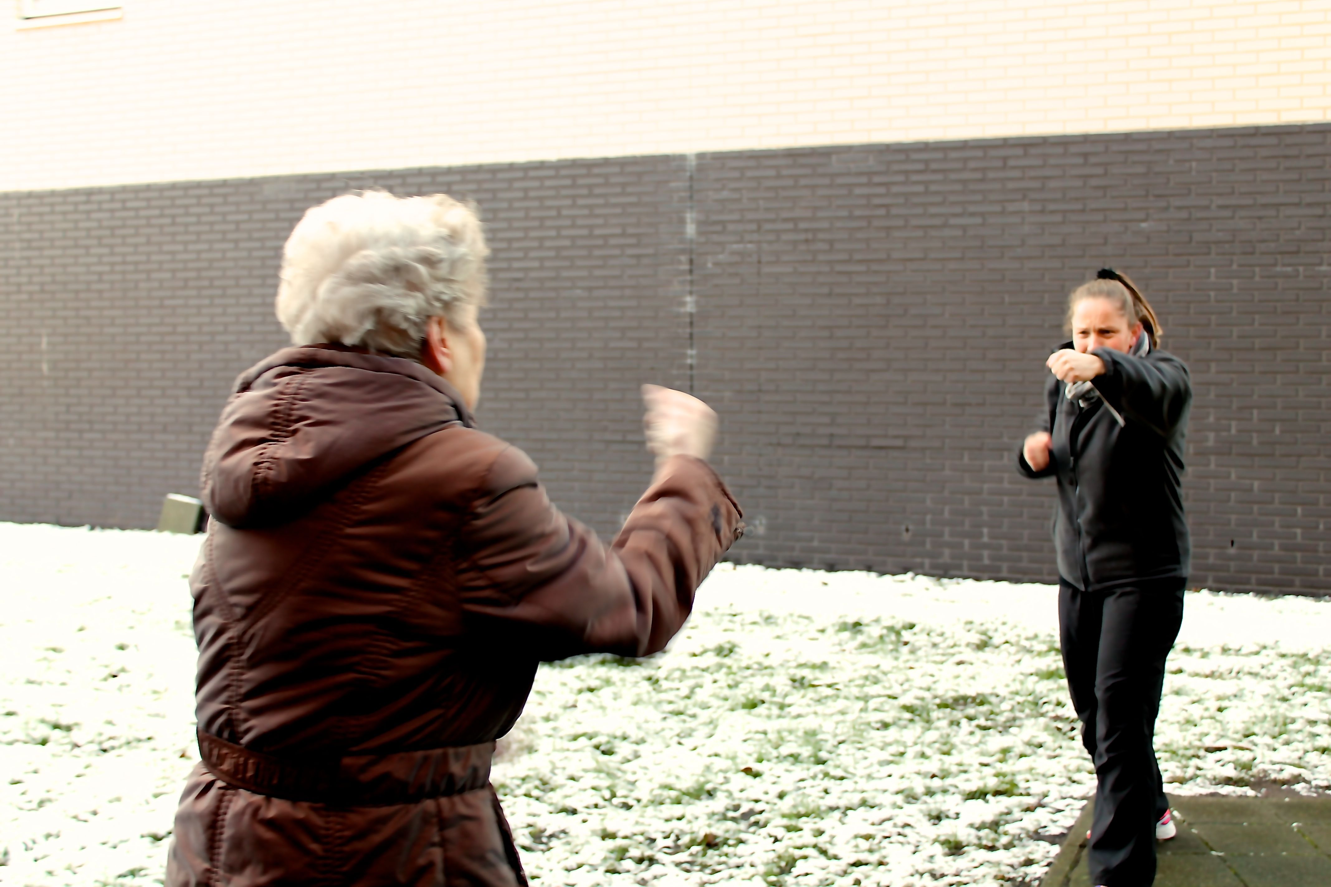 Het trio loopt een hofje in tussen twee appartementsgebouwen. “Nu gaan we boksen, mevrouw Willemsen”, zegt Boosman. De vrouw kijkt haar argwanend aan, terwijl ze haar linnen tas tegen de muur gooit. “Nou, vooruit dan maar”, zegt ze, terwijl ze de ene voet voor de andere zet en haar gebalde vuisten voor zich uitslaat. “Sla hem op zijn neus”, moedigt Boosman haar aan. “Moet dat?” vraagt Willemsen.