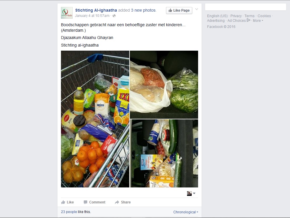 Op 2 november vermeldt Al-Ighaatha op Facebook spullen te hebben ontvangen van een ‘broeder uit Amsterdam’. Bijna een week later volgt hetzelfde bericht, met een foto van een auto vol plastic tassen met onder meer kleren en een emmer. Op 25 november doet de stichting boodschappen voor een ‘behoeftig gezin’ in Molenwijk. 2 december gaat Al-Ighaatha met boodschappen langs bij een ‘zuster’, een maand later bij een ‘zuster met kinderen’. De laatste foto is van een weggeven koelkast, op 5 januari.