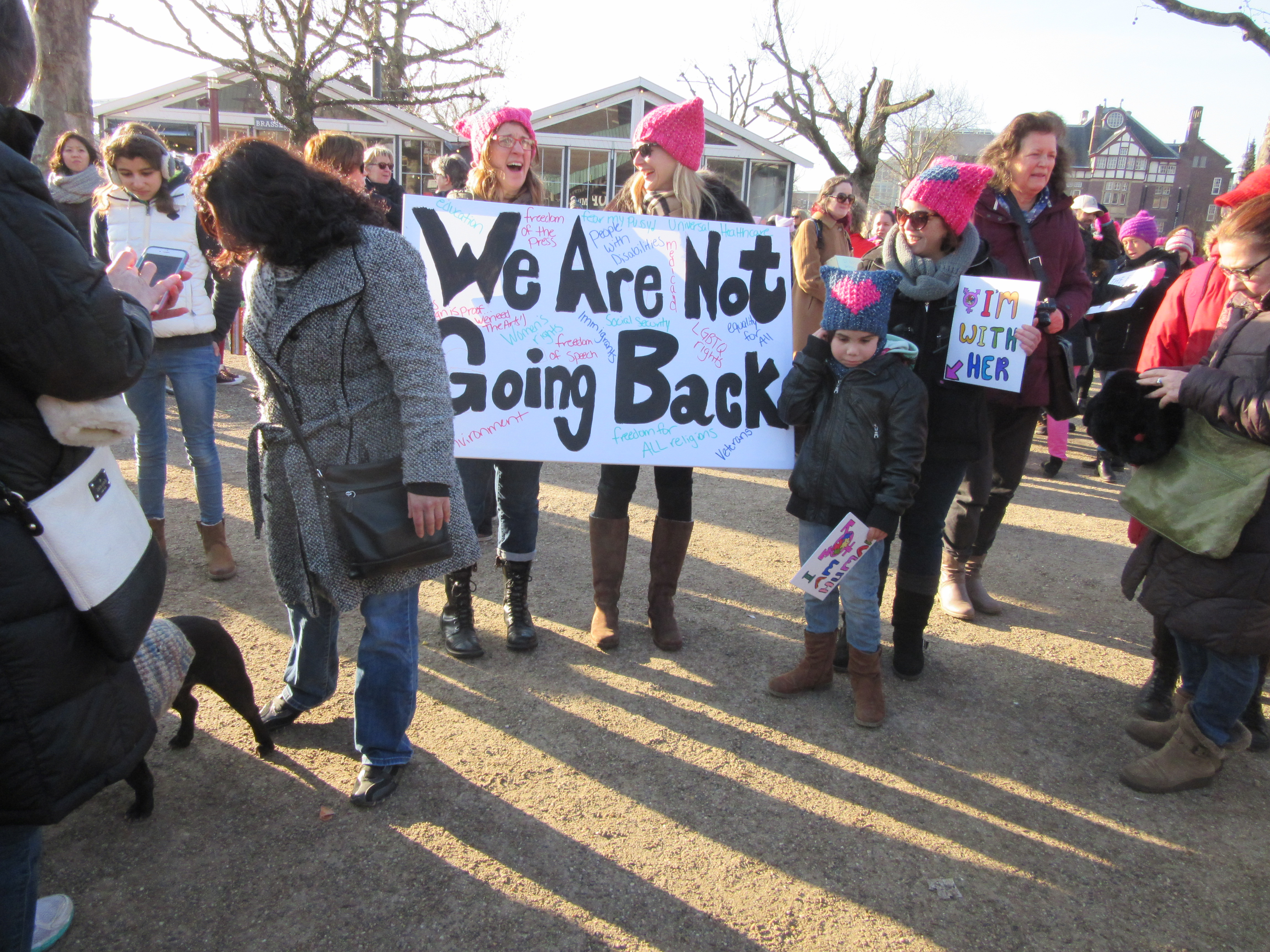 Incidenten zijn er nauwelijks. Als een scooter dwars door de menigte heen wil wanneer de stoet een fietspad kruist en daarbij tegen een paar mensen opbotst, blijven mensen lachen. Veel mensen zeggen hier uit optimisme en solidariteit te zijn, niet uit woede. Maar, zegt student Paula, er mag best een beetje boosheid worden geuit, dat maakt de boodschap sterker. Twee kleine meisjes verenigen de boosheid en tegelijkertijd opgewektheid van de demonstratie. “Hee hee, hoo hoo, Donald Trump has got to go”, zingen ze. Ze maken er een dansje bij.