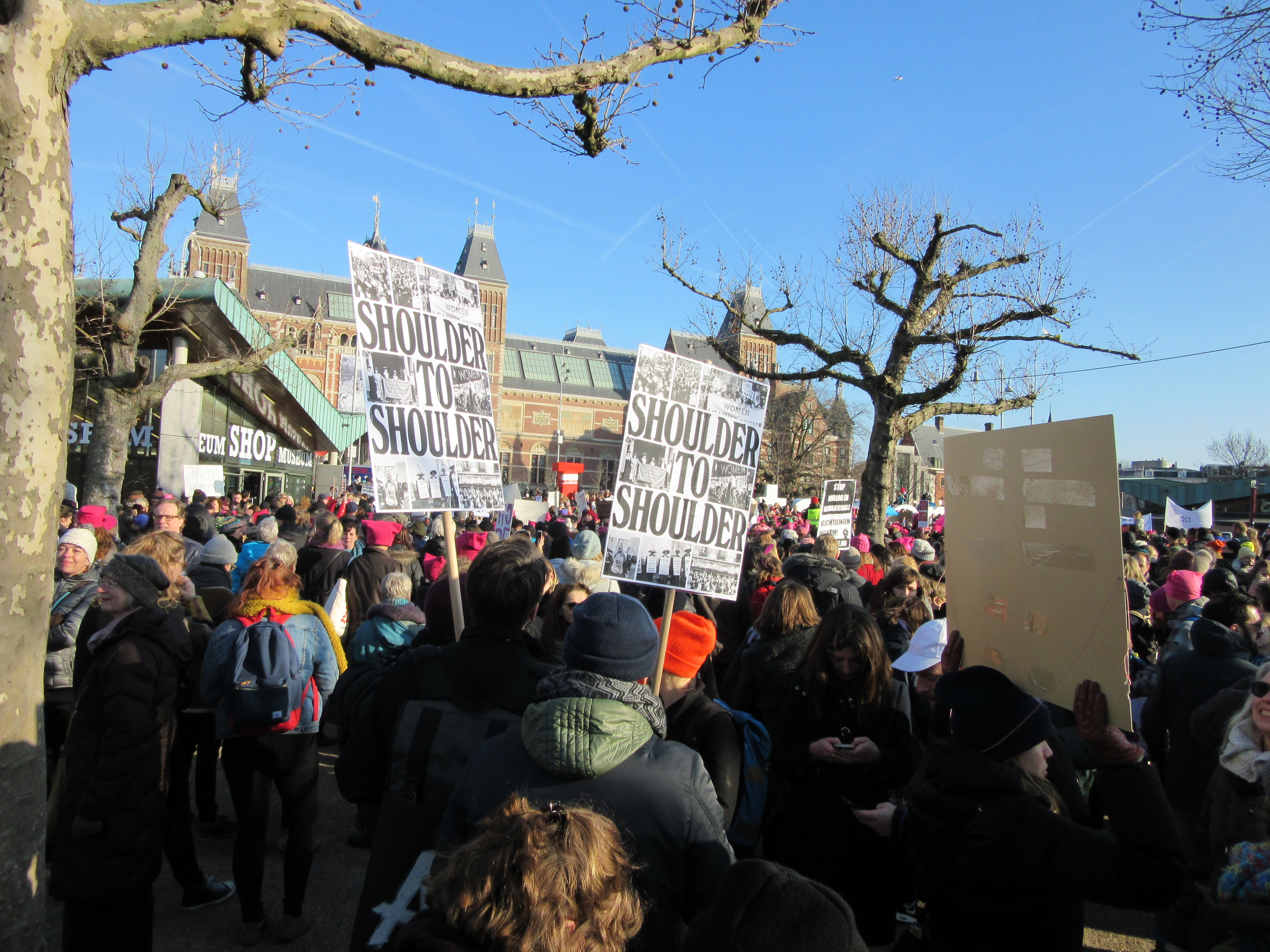 Er zijn veel Amerikanen aanwezig vandaag. Toeristen, maar vooral ook mensen die hier wonen. Paula, een Amsterdamse studente politicologie aan de UvA: “Het is duidelijk dat deze demonstratie de Amerikanen meer aangaat dan de Amsterdammers. Aan de nadruk die hier wordt gelegd op rechten, zie je dat het een vrij Amerikaans protest is.” In het feminisme in Nederland gaat het volgens haar meer om bijvoorbeeld discriminatie en interseksualiteit.