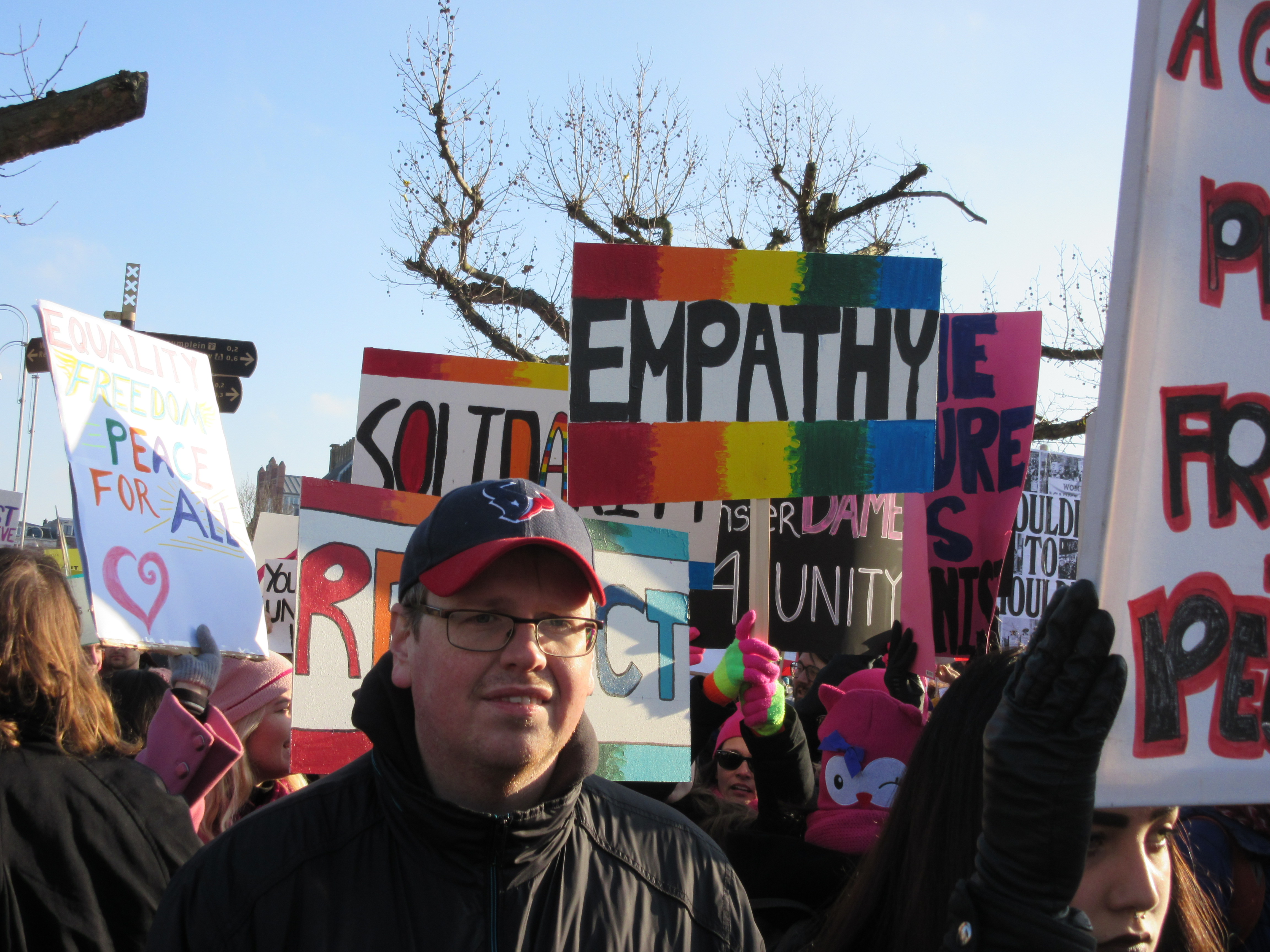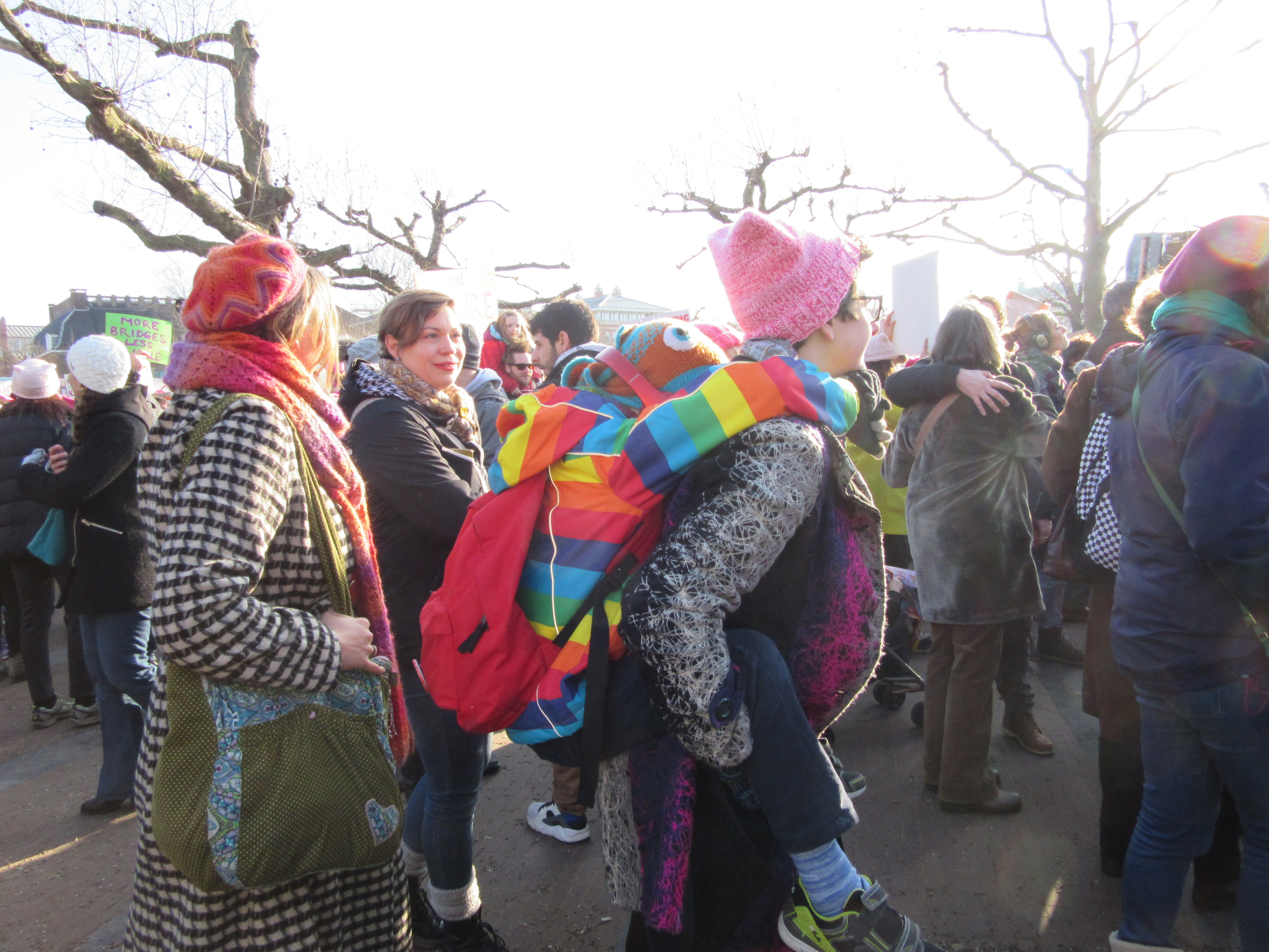 Een van de aanwezige mannen bij de Woman’s March is Hugo, werkzaam bij vredesorganisatie Pax. Hij is vandaag aanwezig omdat hij aan de tegenstanders van Trump in de Verenigde Staten wil laten zien dat het ook hier niet wordt gepikt wat Trump allemaal zegt. “Wel jammer dat de Pussyhats op zijn, ik had er graag een opgedaan.” Hij doelt op de roze gebreide mutsen met kattenoren. Veel demonstranten dragen die vandaag als reactie op de “Grab ‘em by the pussy” uitspraak van Trump.
