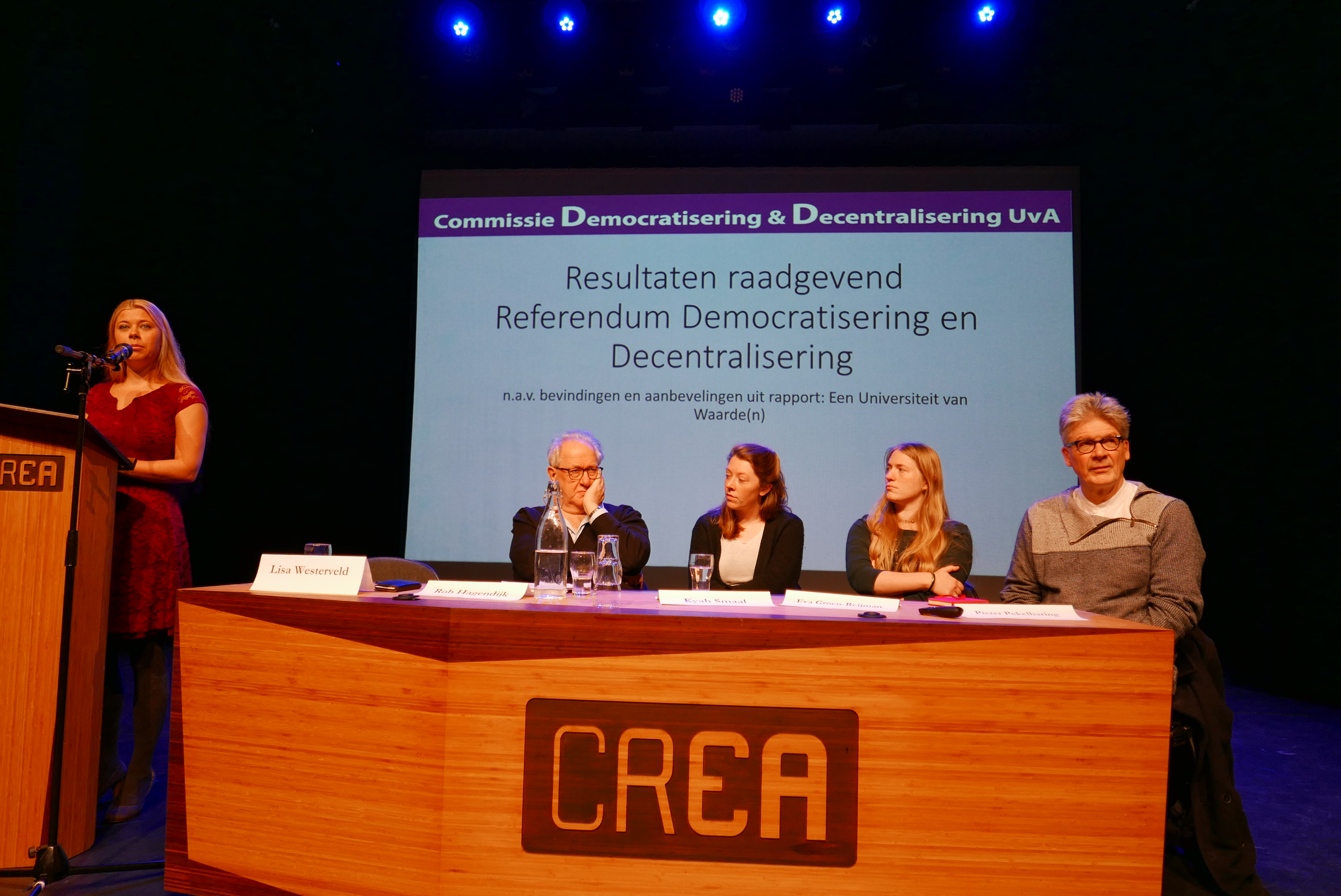 12 procent van alle UvA-studenten en 37 procent van alle UvA-medewerkers namen deel aan het referendum van de commissie Decentralisering & Democratisering. Dat werd eind november vorig jaar ingesteld naar aanleiding van de protesten in het Maagdenhuis in 2015. Het betrof maatregelen om medezeggenschap binnen de UvA-instellingen te vergroten. CvB-voorzitter Geert ten Dam geeft aan dat de opkomst niet hoog genoeg is om de resultaten als representatief te zien, maar dat ze beschouwd moeten worden als aanleiding voor nieuwe gesprekken.