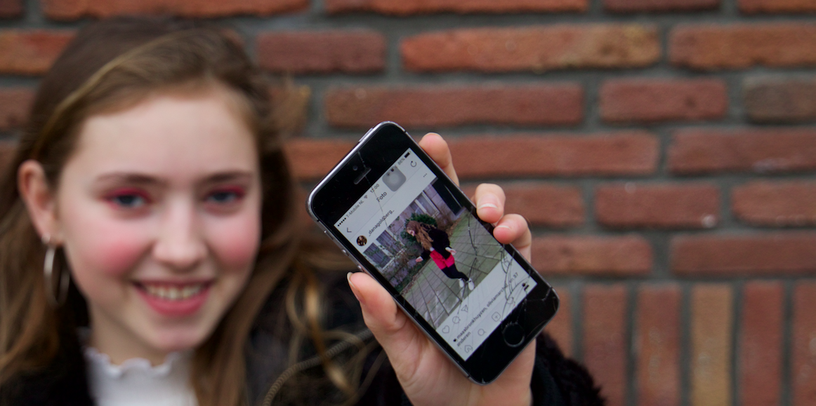 “Ik gebruik Snapchat elke dag, want anders gaan m’n streaks weg en dat is niet de bedoeling. Als je drie aangesloten dagen een foto naar elkaar stuurt, dan krijg je een drietje met een vlammetje achter je naam, dat is een streak. Mijn record is 60 streaks, maar dat is niet super hoog, je hebt ook mensen die 300 of 400 streaks hebben. Instagram gebruik ik ook veel, ik heb net nog wat gepost. Volgens mij heb ik 600 volgers. Soms verwijder ik ook foto’s als ik denk: ‘Dat is niet meer wie ik nu ben’. Ik post ook wel foto’s van vriendinnetjes, daar sta ik zelf niet altijd op. Soms ga ik ook gewoon via het zoekicoontje naar filmpjes kijken. Dat is wel gevaarlijk, want dan ben je ineens alweer een uur verder.”