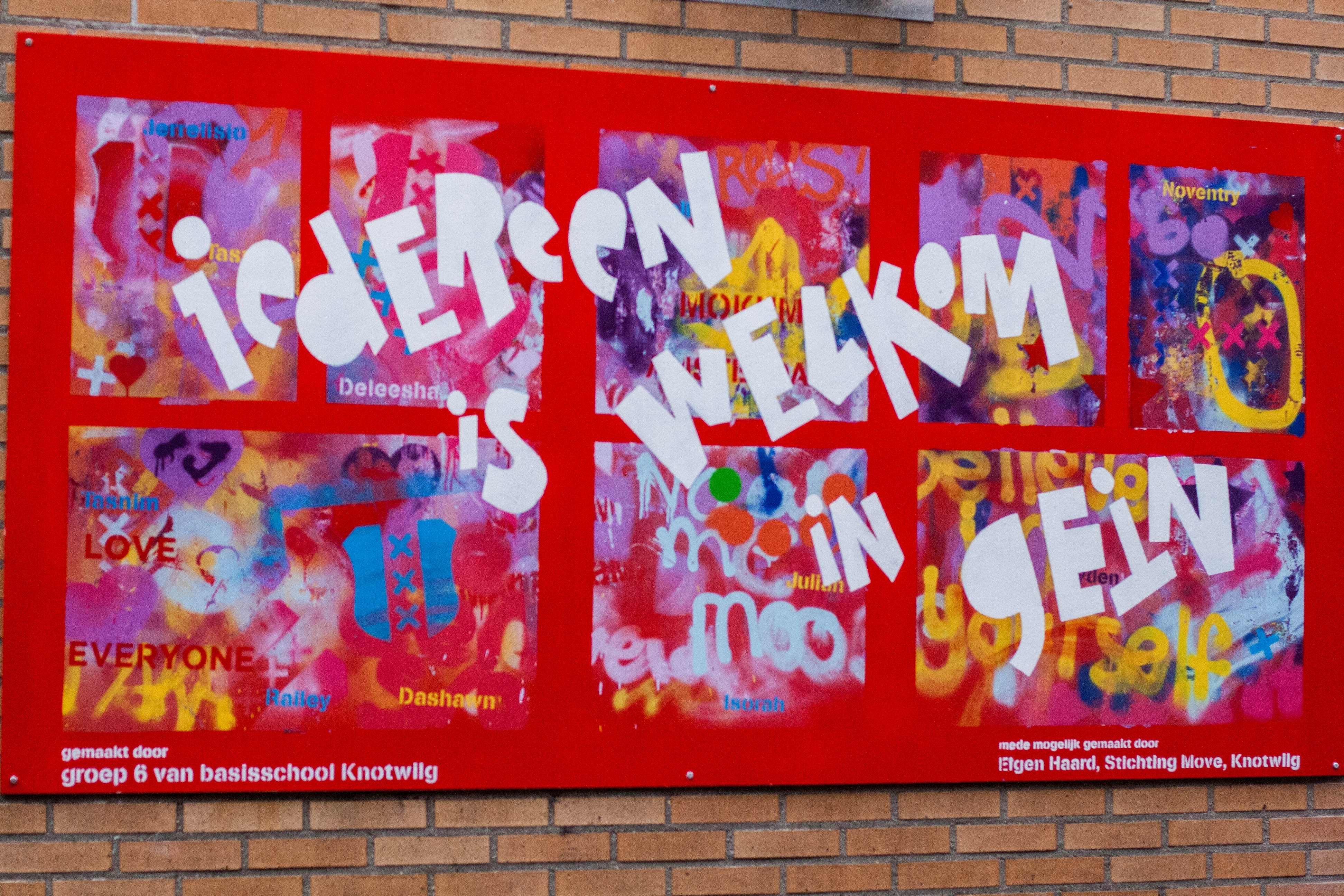 Allemaal willen ze dolgraag van alles vertellen over hun wijk en het Move-project waar ze het afgelopen jaar aan hebben meegedaan. Samen met vier studenten Culturele Antropologie aan de Universiteit van Amsterdam zijn ze op onderzoek gegaan in de wijk en hebben ze een project bedacht en uitgevoerd om iets positiefs voor de wijk te betekenen. Het werd uiteindelijk een kunstproject met lieve graffiti. “Het was een super cool en leuk project!”, aldus Jayden.