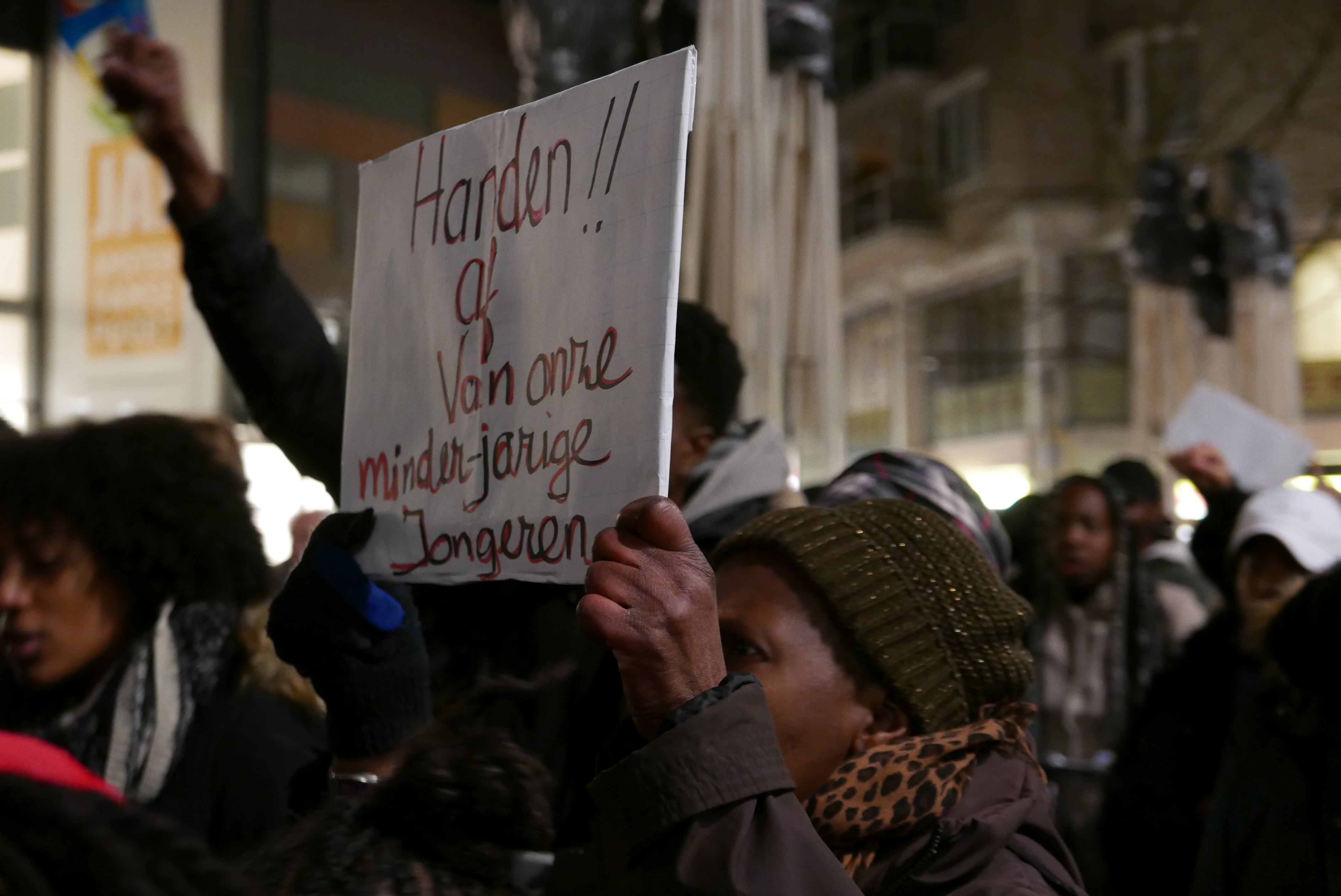 Duidelijke taal op het Bijlmerplein in Zuidoost, waar donderdagavond een honderdtal mensen verzameld zijn tegenover de McDonalds. Het is er ijskoud, maar “dat jullie allemaal zijn gekomen, geeft veel warmte”, zegt activist Jeffrey Afriyie, die eerder ook tegen Zwarte Piet demonstreerde. Het evenement kreeg de naam ‘We Know Our Rights!’ op Facebook. De aanleiding is de aanhouding van een twaalfjarige zwarte jongen op dinsdag, bij het winkelcentrum de Amsterdamse Poort. De jongen werd beboet en in de boeien geslagen omdat hij fietste op een plaats waar dat niet was toegestaan, en daarna weigerde zich te identificeren.