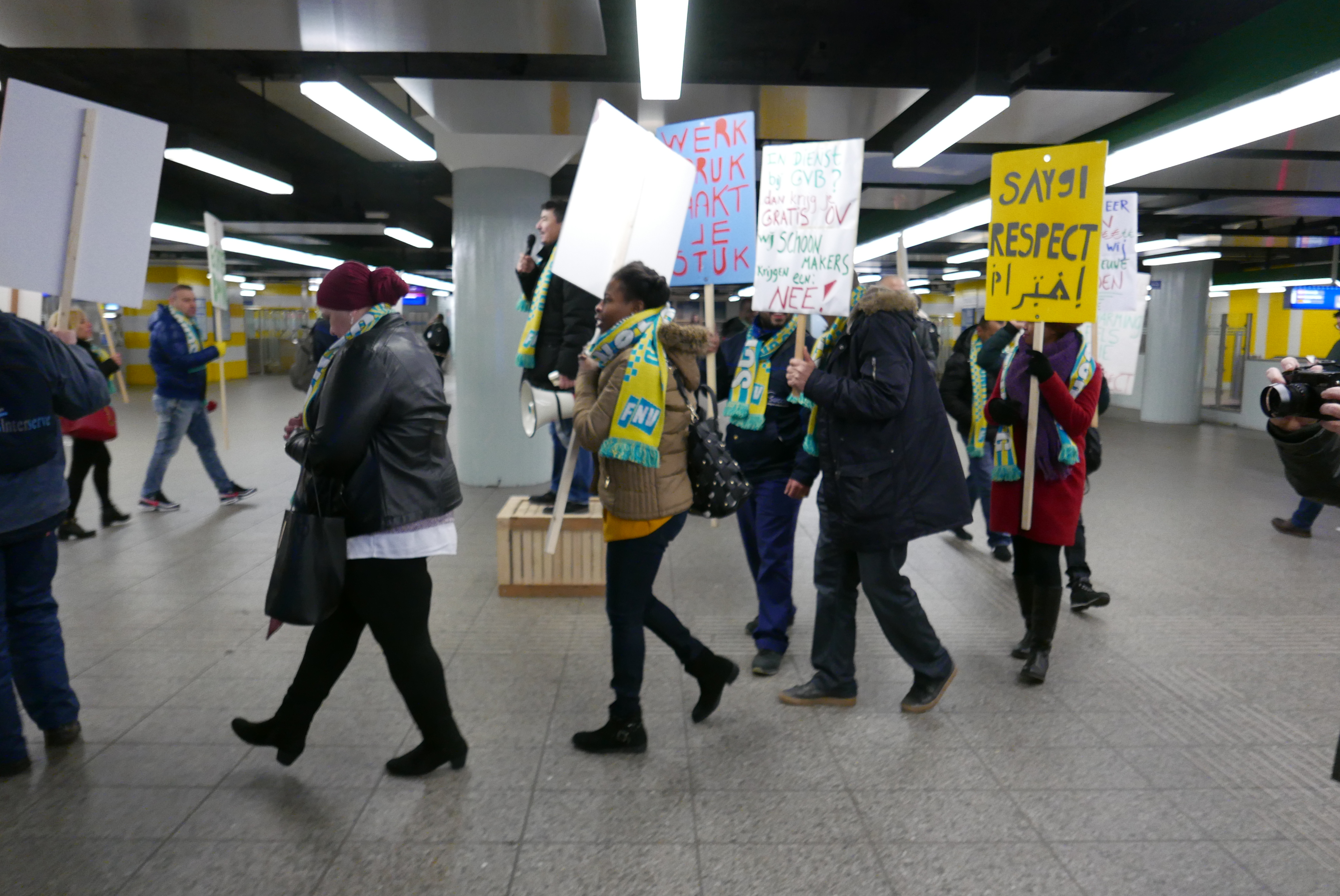 “Wij zijn het zat. Wij willen ons gezin kunnen onderhouden”, begint een van de GVB-schoonmakers zijn speech. “Wij willen normale plekken om te lunchen tijdens ons werk en we willen gratis kunnen reizen.” Khadija Hyati, president van het ‘schoonmakersparlement’ binnen de vakbond FNV Schoonmaak, licht toe: “De medewerkers van het GVB mogen altijd gratis reizen, de schoonmakers krijgen niet eens hun woon-werkverkeer vergoed.” “En als de schoonmakers willen lunchen”, gaat ze verder, “moeten ze dat vaak op straat doen”. Ze mogen niet op dezelfde plek als GVB’ers lunchen, of er is gewoon geen geschikte plek. Op de sectorbrede eis van 2.5 procent loonsverhoging wordt volgens de vakbond niet gereageerd. Schoonmakers verdienen nu gemiddeld 1400 euro per maand.
