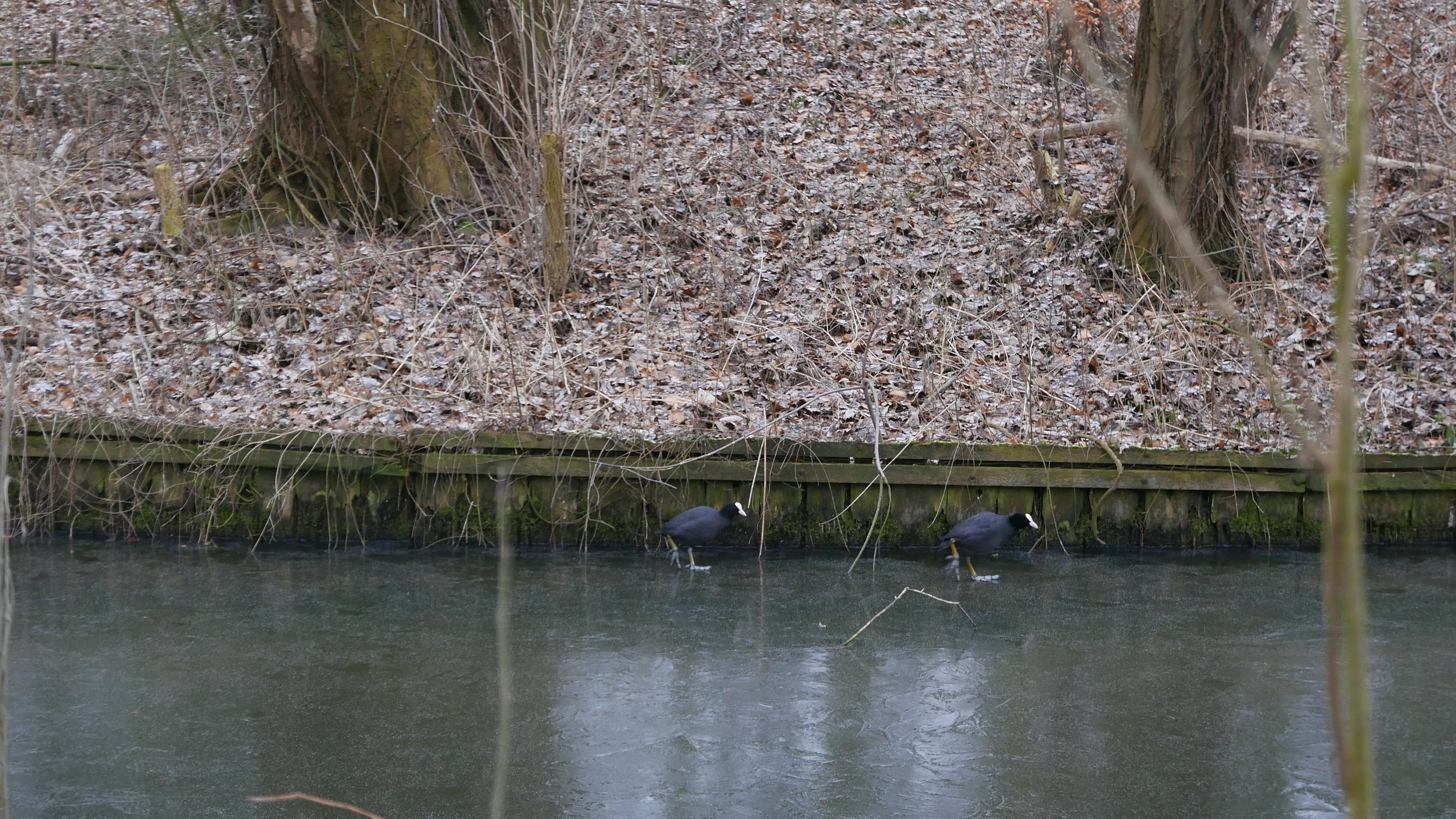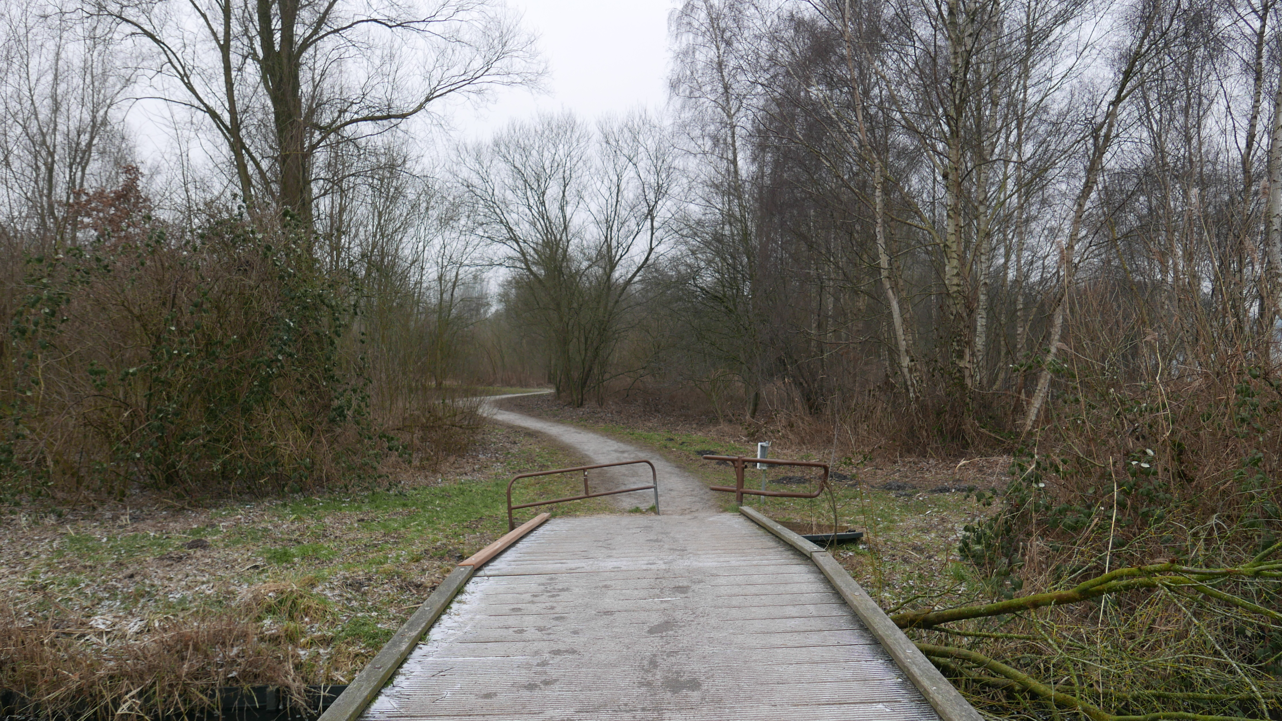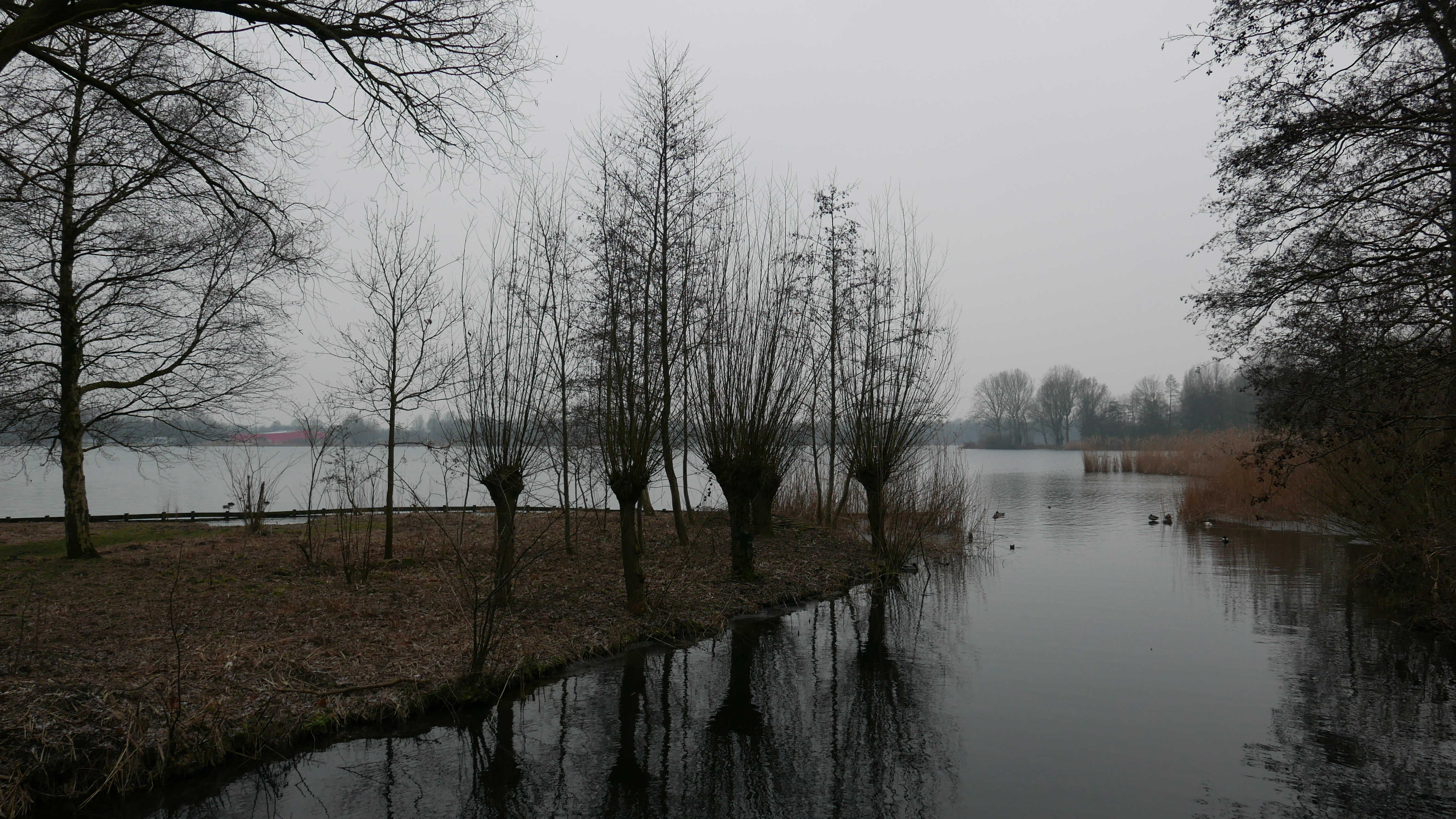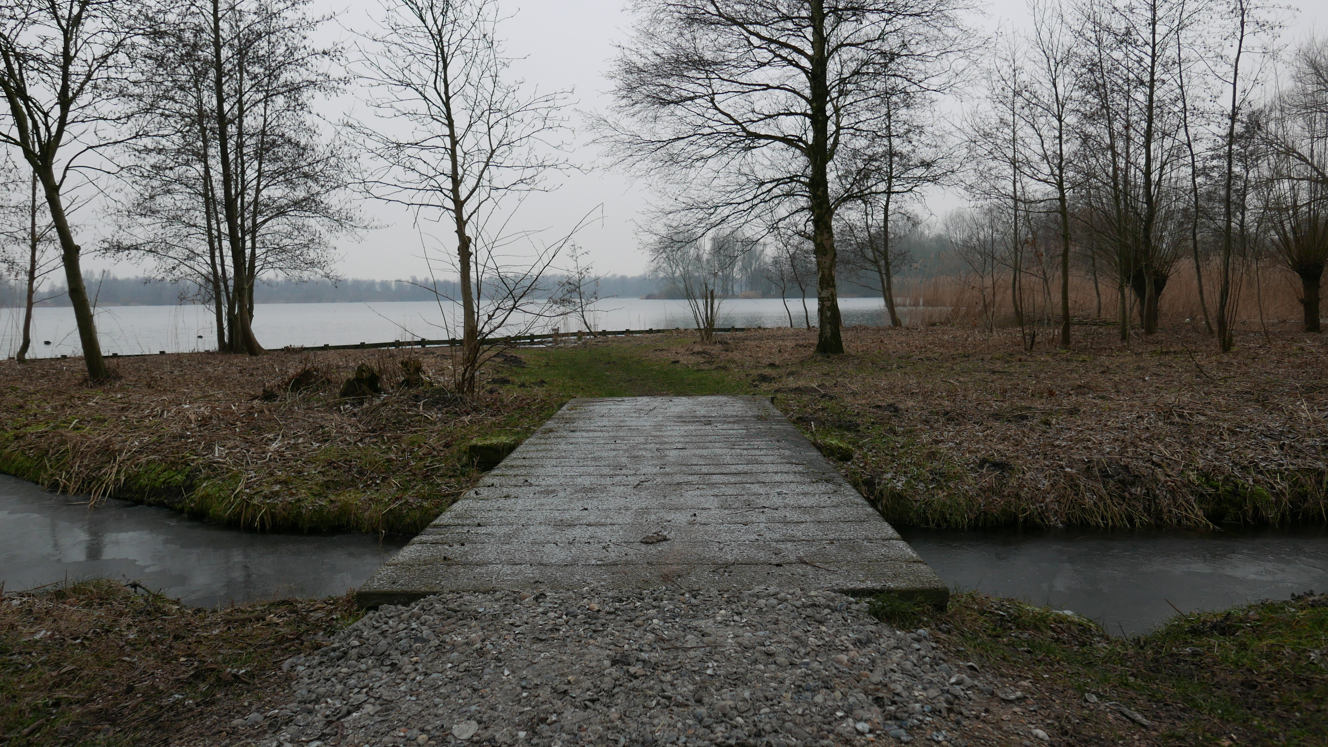 De paadjes liggen er verlaten bij als ik het recreatiegebied betreed. Tussen de bomen door vang ik een enkele keer een glimp op van een hond met een baasje. Verder is het stil. Meerkoetjes glijden over een bevroren sloot. IJzel op houten bruggetjes. Geknotte wilgen. Het pad onder mijn voeten kraakt. Schelpen- en zandweggetjes wisselen elkaar af.