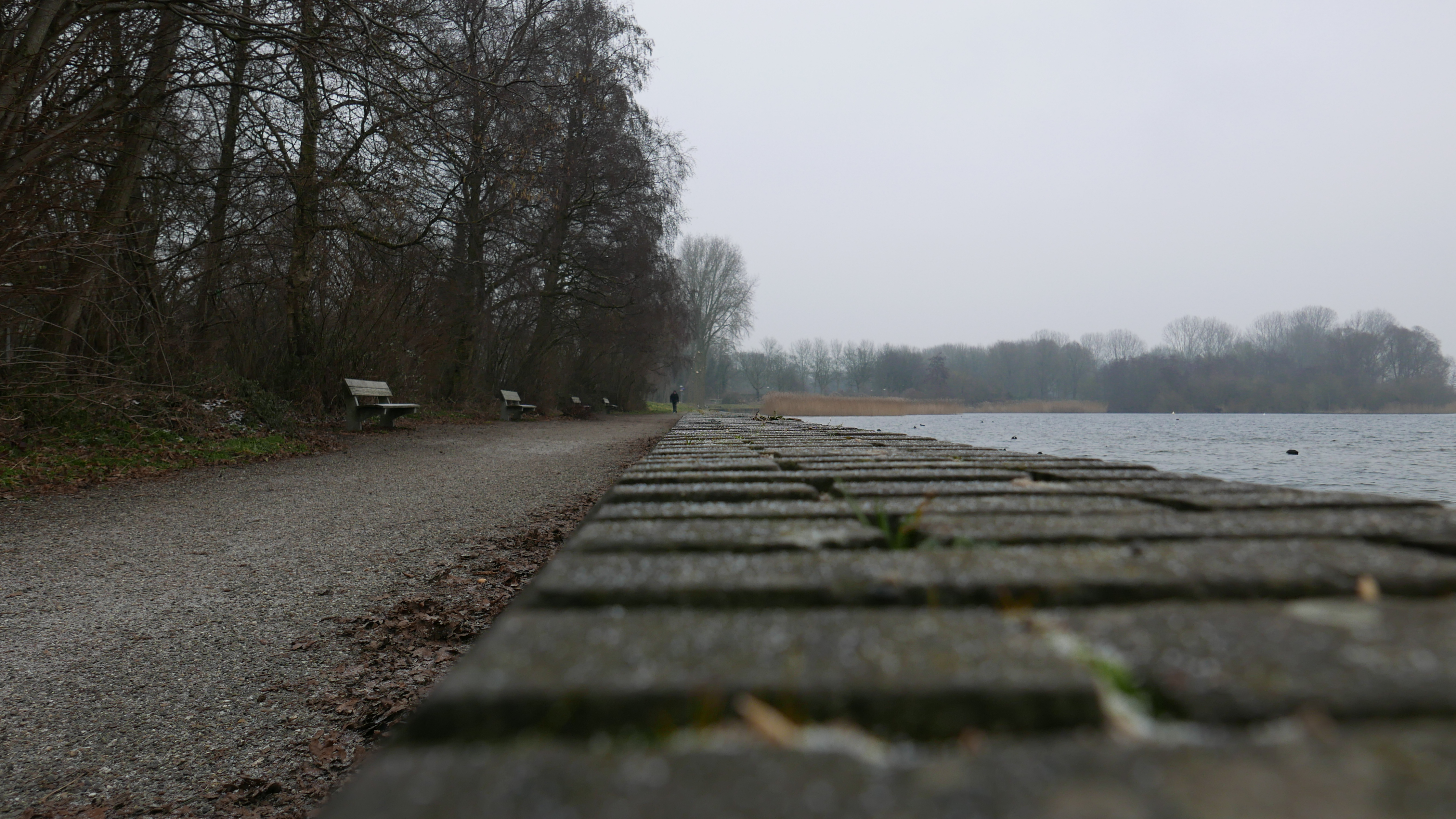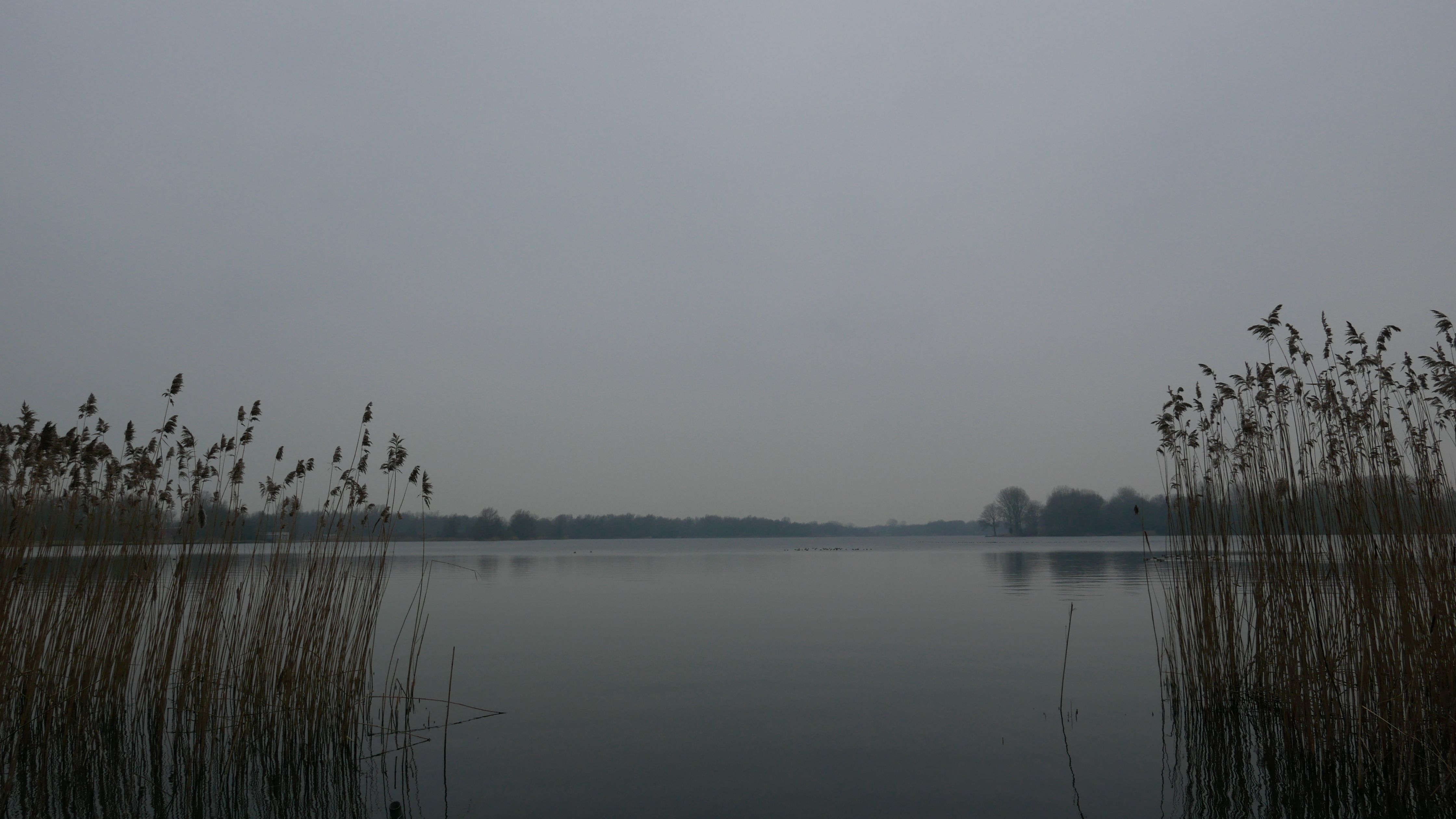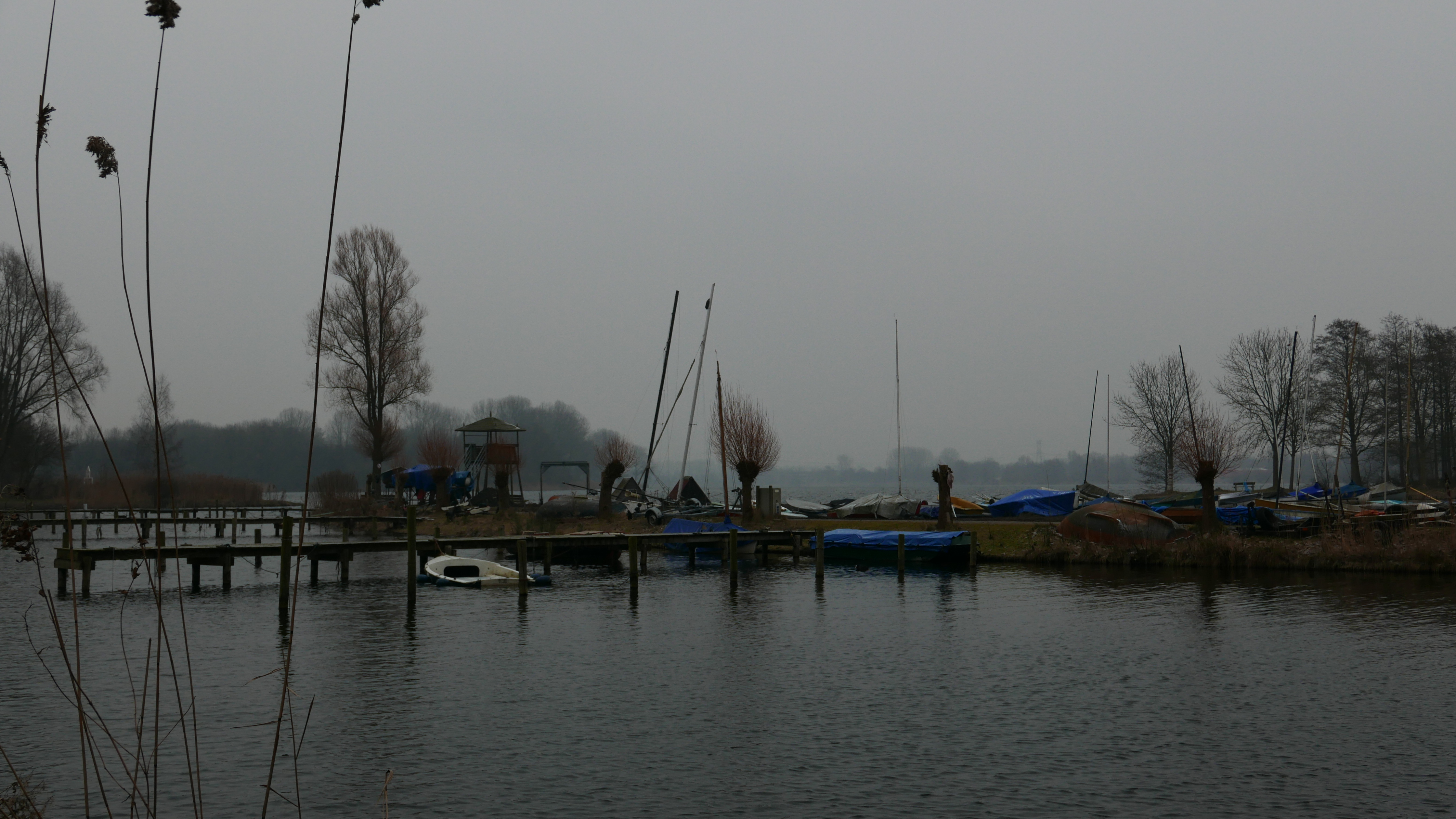 Het geluid van een vliegtuig dat onzichtbaar door een grijs wolkendek trekt. Sneeuwvlokjes dwarrelen neer. Het water klotst, dan harder, dan zachter, tegen de kant. Het eeuwige stromen, wuivend riet. De snijdende wind langs je lichaam. Gekraak, geritsel, meer niet. Een roodborstje hupt van tak naar tak, steeds iets voor me uit.