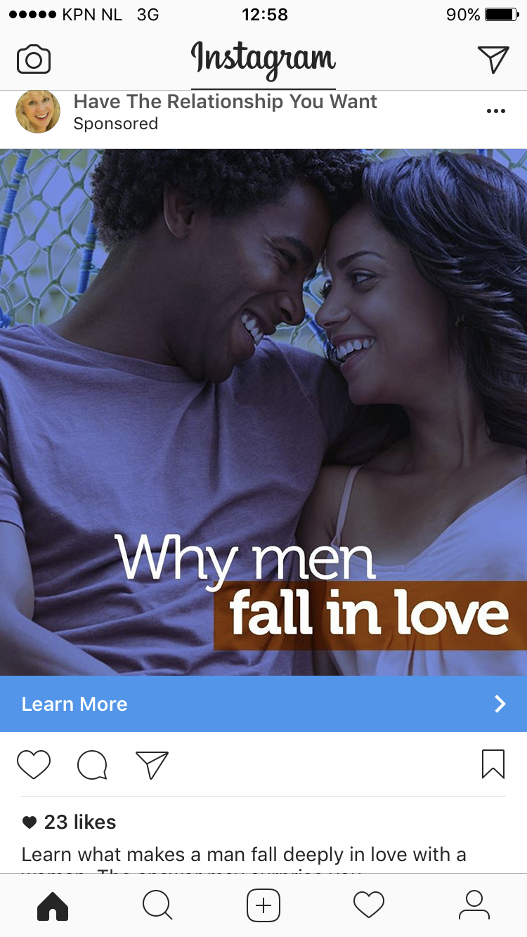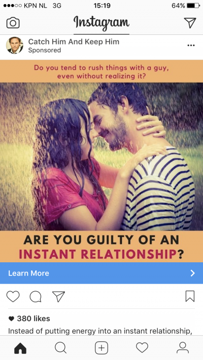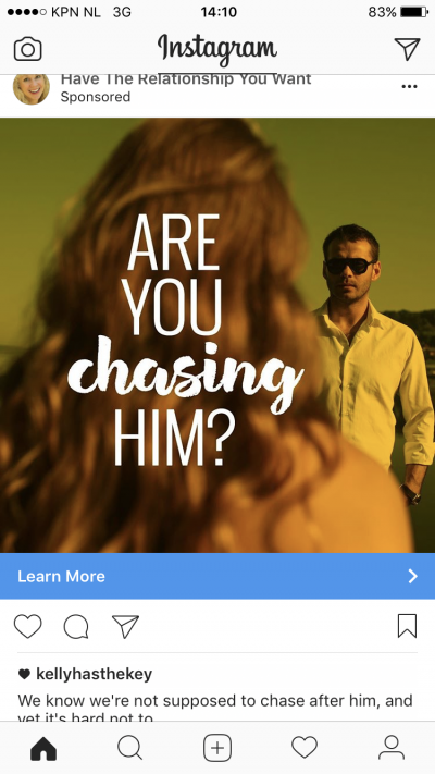 Een specifieke reclame, waarop een koppel innig staat te zoenen in de regen, keert om de vijf selfies terug op mijn scherm. De kop: “Are you Chasing him?” Ondertitel: “We know we’re not supposed to chase after him, and yet it’s hard not to. Learn exactly what to do when he’s pulling away that will have him begging you for commitment.”