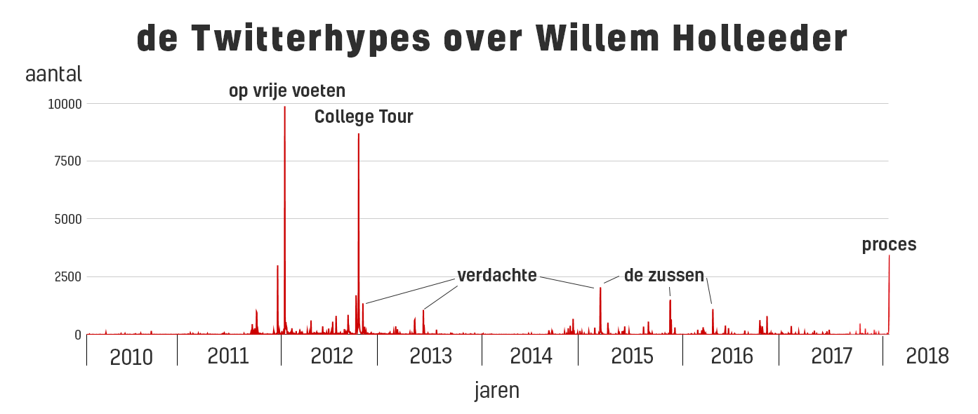 Ruim 150 duizend tweets werden de afgelopen acht jaar over Willem Holleeder het web op geslingerd. Het aantal tweets over Holleeder steeg op 15 verschillende dagen tot boven de duizend.