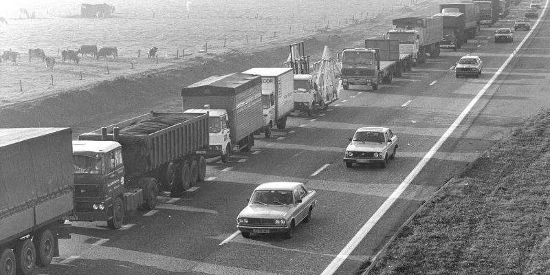 Header: Kilometerslange file na een stiptheidsactie bij de douane aan de Nederlands-Belgische grens. Foto: ANP Historisch Archief. Formaat aangepast.