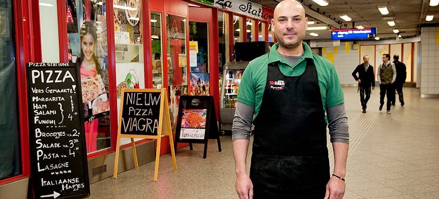 Ik stuit op een artikel van de Metro uit 2014 over de woede van ondernemers in metrostations, die vanwege renovaties hun winkels steeds tijdelijk moesten sluiten. Voor het eerst in vier jaar kijk ik pizzabakker Hussein in zijn vreugdevolle ogen. Op de foto in het stuk poseert bij zijn zaak. Achter hem is het Viagrabord zichtbaar. ‘Ik verlies telkens weer klanten’, vertelde hij de journalist. ‘Dan weer open, dan weer dicht. Mensen zijn er op een gegeven moment wel klaar mee en gaan naar een andere plek waar ze blijven hangen.’