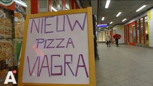 ‘Nieuw: Pizza Viagra!’, lees ik na een lange schooldag op een reclamebord in metrostation Waterlooplein. Het is 2013 en mijn achttienjarige brein probeert de provocerende snack te negeren.