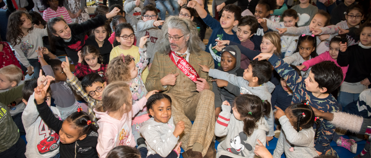 AMSTERDAM – Met luid gejuich, tromgeroffel en een sjerp onthaalde OBS De Krijtmolen in Amsterdam-Noord maandagochtend kinderboekenschrijver Aby Hartog. Als schoolschrijver gaat hij een half jaar lang iedere dinsdag op de basisschool aan de slag om het leesplezier en de schrijfvaardigheid van de leerlingen te vergroten.