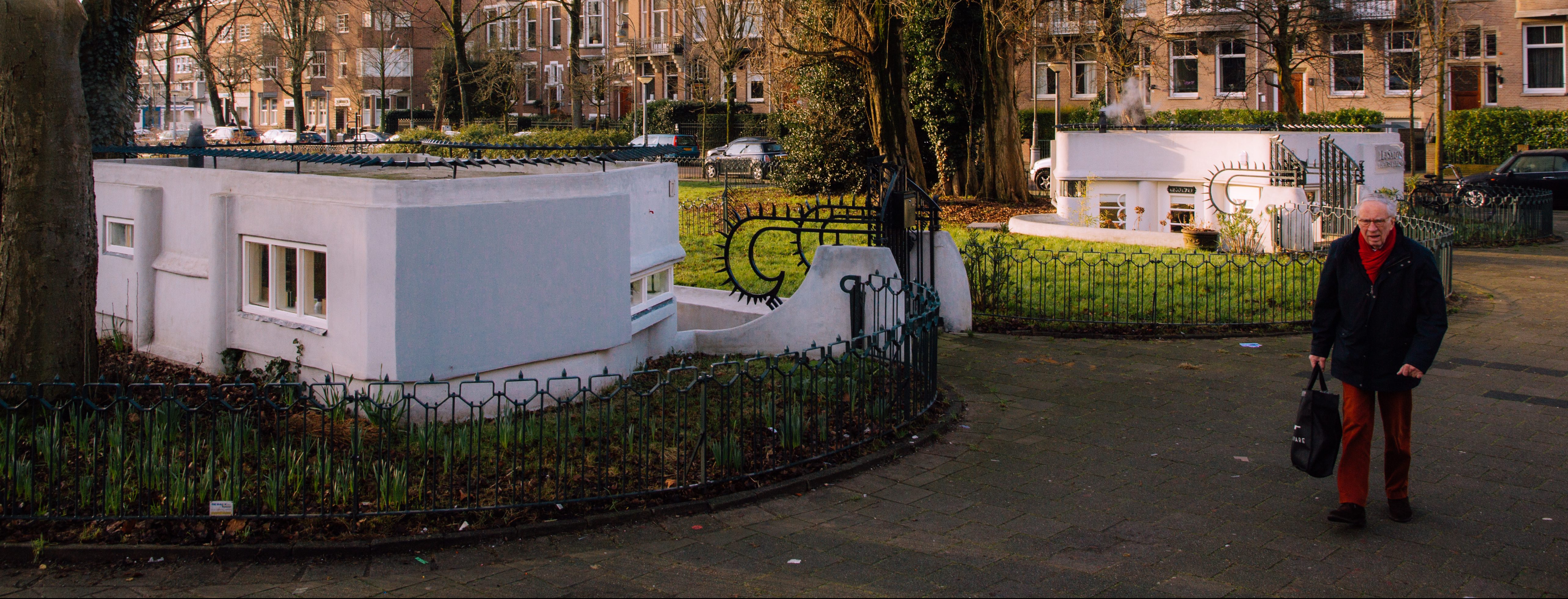 Sierlijke, smeedijzeren, donkergroene hekken langs het grasveld begrenzen de privaathuisjes uit 1922. ‘Ik heb echt een zwak voor de huisjes’, zegt Sascha Tulp, die opgroeide in Zuid. ‘Ze zijn een beetje bunkerachtig, maar door de organische vormen hebben ze ook iets weg van slakkenhuizen.’ Jarenlang maakte Tulp zich hard voor renovatie van de gebouwtjes. Met succes: na een traject van tien jaar waren ze in 2013 opgeknapt.