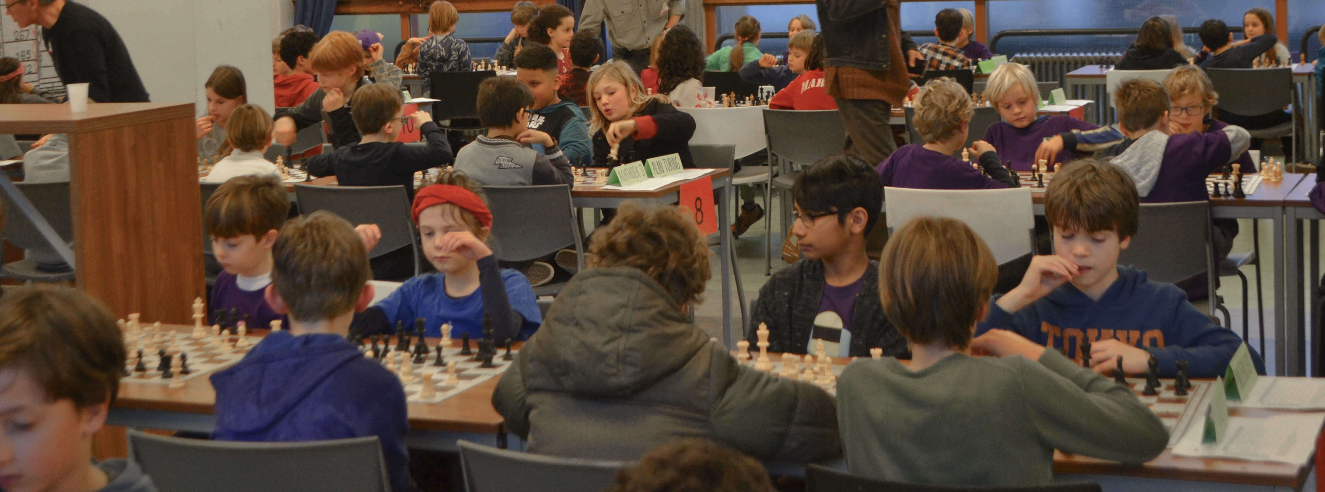 Nova is een van de 112 leerlingen die zondagmiddag meedeed aan de voorronde van het basisscholenkampioenschap van het Vereenigd Amsterdamsch Schaakgenootschap (VAS), de oudste schaakvereniging van Nederland. In de aula van het Cygnus Gymnasium namen teams van veertien basisscholen uit Amsterdam-Centrum, Watergraafsmeer, Zeeburg, Zuid-Oost en Noord het tegen elkaar op. ‘Ik schaak pas sinds een paar maanden. Dit is mijn eerste toernooi’, vertelt Nova. ‘Ik vind het heel erg leuk, want tot nu toe heb ik alle wedstrijden gewonnen. Mijn geheime wapen is een trucje: schaakmat in drie zetten.’