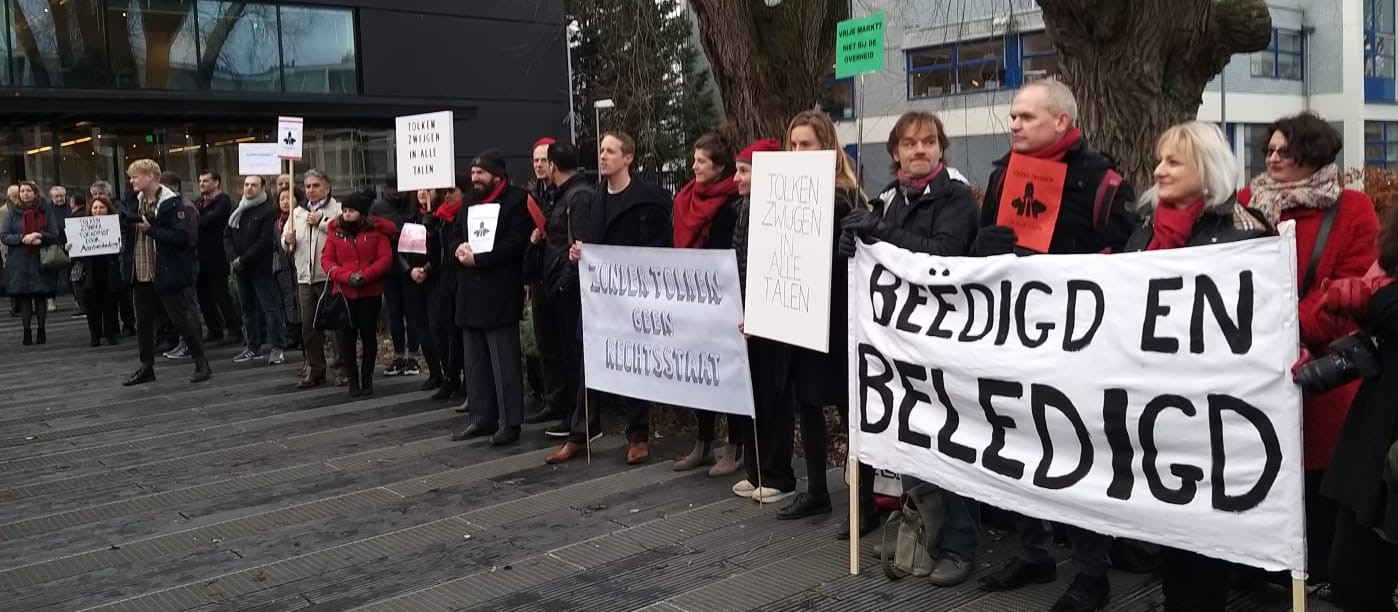 Literair vertalers zijn ze niet, maar inventief zijn ze wel. ‘Tolken zwijgen in alle talen’ staat op een bordje, ‘beëdigd en beledigd’ staat op een ander. Enkele tientallen tolken en vertalers staan vandaag voor de Rechtbank Amsterdam. Ze werken daar elke dag als tolk in rechtszaken, maar vandaag protesteren ze tegen beleid van minister Grapperhaus. Daarnaast gaat een landelijke staking van start.