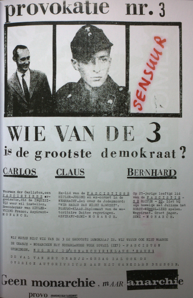 Voor de eerste openbare daad van Provo in 1965 maakte de beweging een pamflet met daarop drie foto’s: eentje van Spaans politicus Carlos. ‘Een fascist,’ zegt Blans. Eentje van prins Bernhard. ‘Deze was zeker een fascist’. Eentje van Claus von Amsberg, ‘ook een fascist, of nou ja,’ zegt hij twijfelend. ‘Van de drie op het pamflet was Claus de grootste democraat.’ Onder de foto’s stond de tekst: ‘We weten niet waarom de Oranje-monarchen het Nederlandse volk zoveel (ex?) fascisten opdringen. Weg met de monarchie: Klaus raus!
