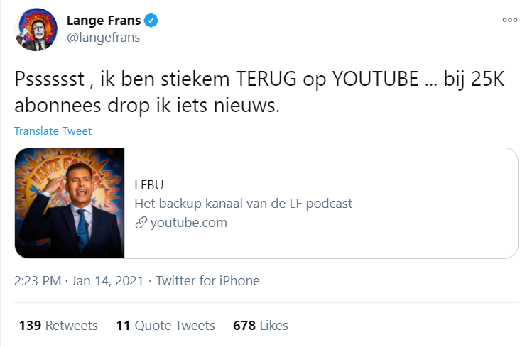Op donderdag 14 januari vroeg Lange Frans zijn volgers op Twitter en Instagram al om zich op het nieuwe kanaal te abonneren: ‘Psssssst , ik ben stiekem TERUG op YOUTUBE … bij 25K abonnees drop ik iets nieuws.’