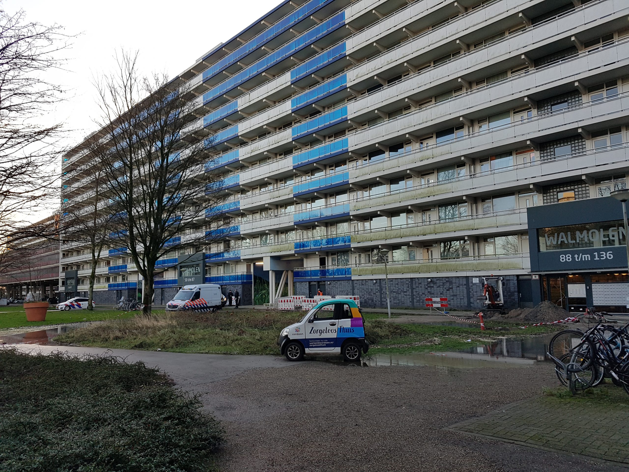 De ochtend na de brand staan er nog twee politieauto’s voor de flat in de Walmolenstraat. Buurtbewoner Ria van Vliet staat samen met haar man en twee roodharige chihuahua’s te kijken naar de flat. ‘Het is mooi klote, we moesten zo snel weg zijn dat zelfs mijn hondjes niet mee mochten naar buiten. Dan sta je maar te kijken naar de flat en te hopen dat je hondjes het overleven.’