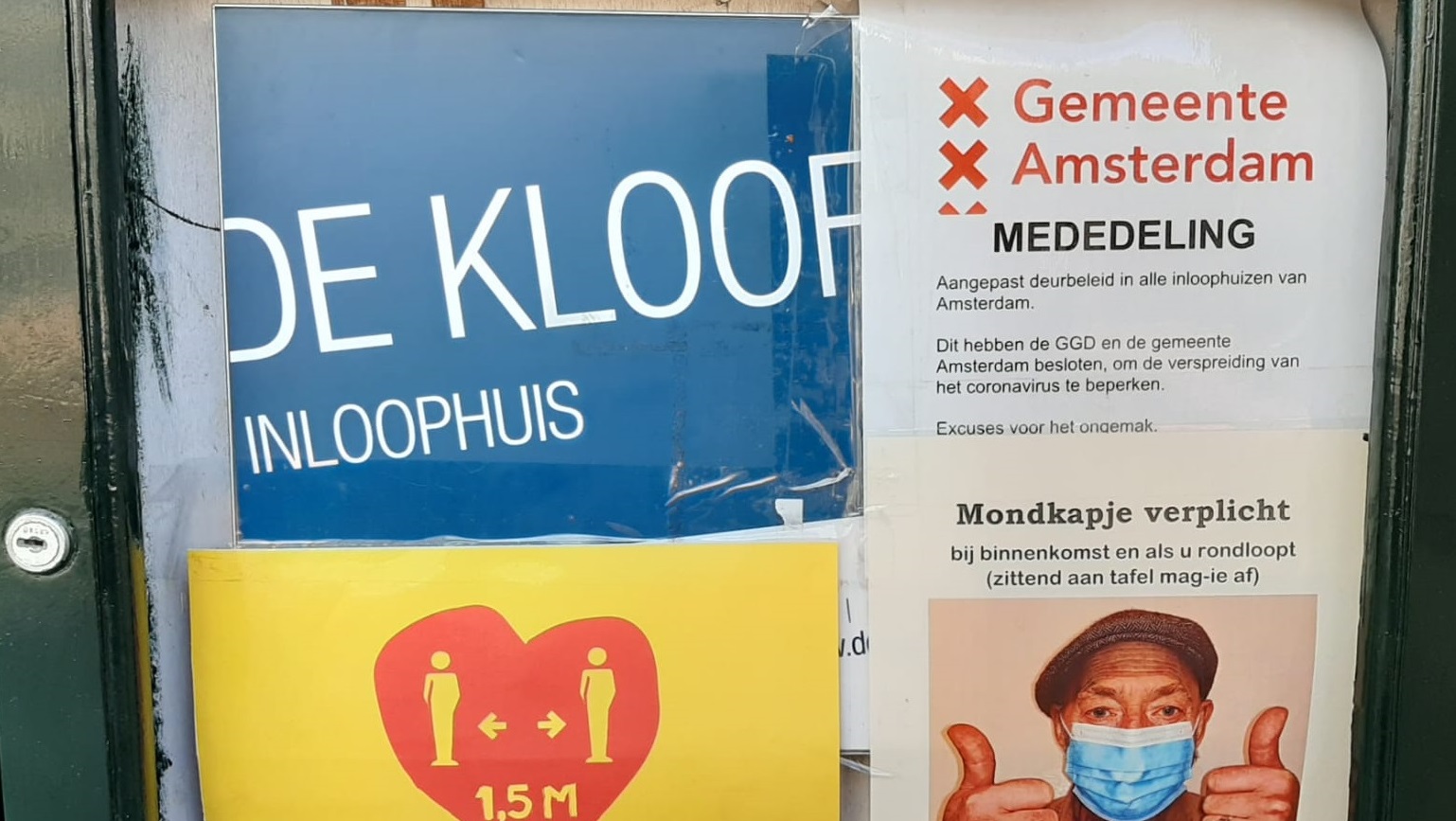 Inloophuis De Kloof van De Regenboog Groep is de oudste Amsterdamse opvang voor dak- en thuislozen. De kelder van het Vincentiushuis aan de Kloveniersburgwal is voor veel bezoekers als een woonkamer, zij komen kom hier bijna elke dag. Op de tafels liggen papieren met informatie over de avondklok die de voorgaande avond is ingegaan. Daar staat onder andere op dat de bezoekers het bij de medewerkers moeten aangeven als zij een boete hebben gekregen.