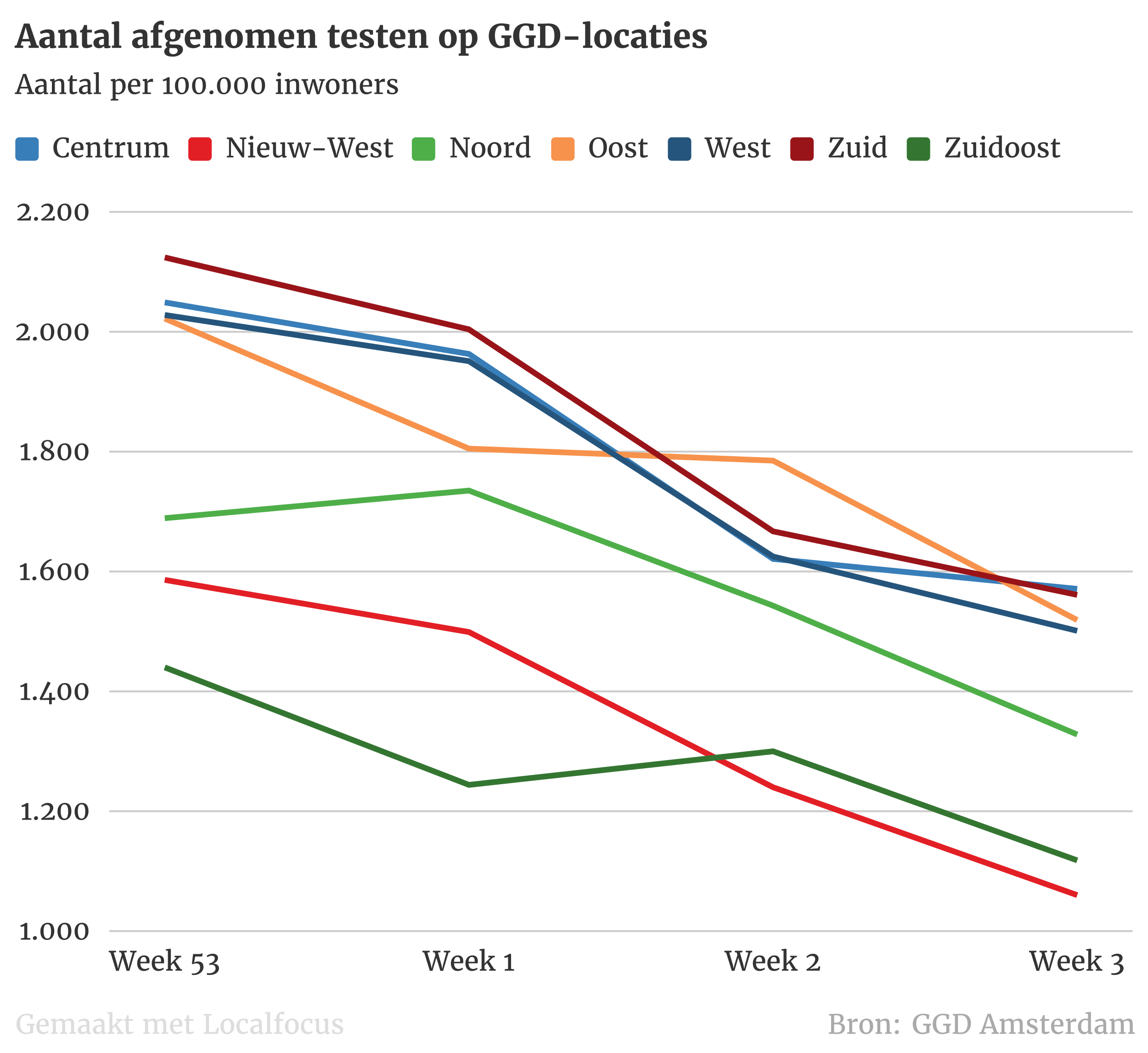 Afgelopen week (18 t/m 24 januari) is het aantal positieve testen in alle stadsdelen van Amsterdam gedaald. De laatste cijfers van de GGD laten een veel sterkere daling zien dan vorige week. Het absolute aantal positief geteste inwoners in de gemeente Amsterdam is met 17 procent afgenomen, waar het vorige week om een afname van 6 procent ging. Daarmee daalde het risiconiveau van de meeste stadsdelen naar ‘zorgelijk’. Geen enkel stadsdeel bevindt zich nog op risiconiveau ‘zeer ernstig’.