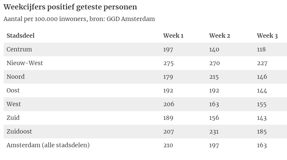De cijfers zijn gebaseerd op de actuele weekcijfers van de GGD Amsterdam en het RIVM. Omdat sommige besmettingen later worden gemeld, kunnen de gerapporteerde cijfers nog worden aangepast. Het RIVM benadrukt dat niet alle mensen met corona zich laten testen, waardoor het werkelijke aantal besmette personen waarschijnlijk hoger ligt.