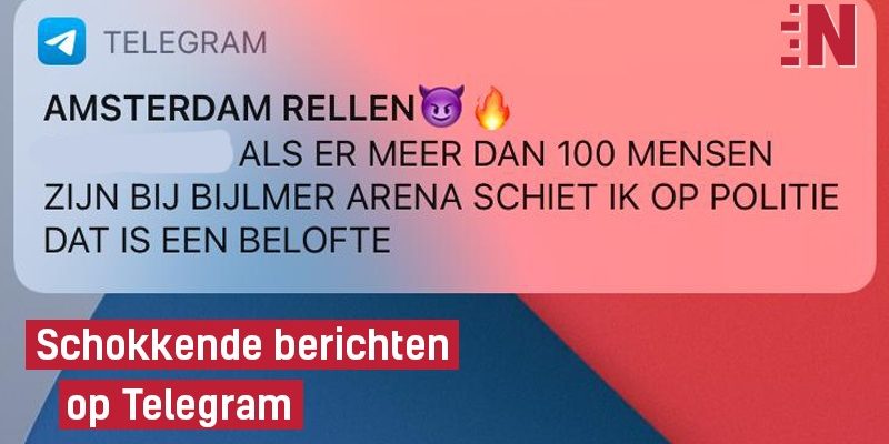 ‘ALS ER MEER DAN 100 MENSEN ZIJN BIJ BIJLMER ARENA SCHIET IK OP POLITIE DAT IS EEN BELOFTE’, stuurt “Kolonel Dc” via Telegram in de “AMSTERDAM RELLEN” appgroep afgelopen dinsdag. Kolonel Dc is oprichter en beheerder van de groep in kwestie. ‘DEEL MASSAAL’ voegt hij er nog aan toe.