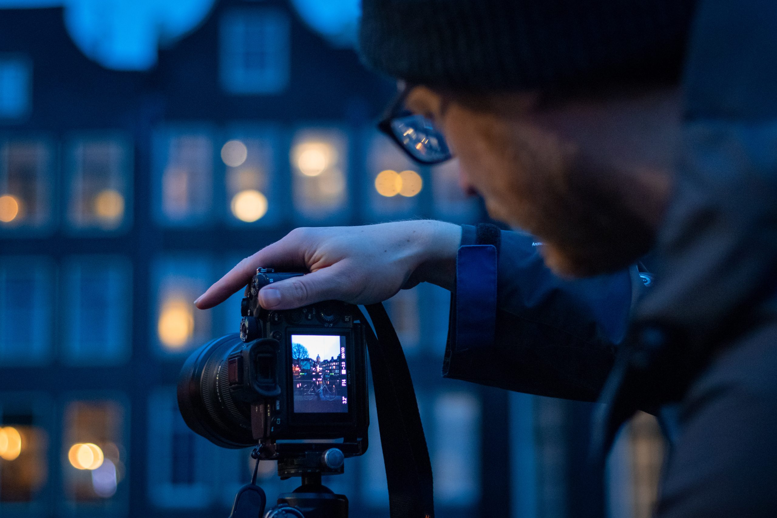 Albert Dros – 35 jaar, grijze muts, rood baardje – komt aanlopen met zijn fiets aan de hand. Hij wacht nog even met foto’s maken, zegt hij terwijl hij zijn fiets wegzet en het straatje achter de Oude Kerk uitloopt. ‘Het is nu te grauw om bij daglicht foto’s te maken en te licht om de lampjes er goed op te krijgen. Gelukkig is het redelijk windstil, dan krijg je mooie reflecties zodra de zon onder is.’